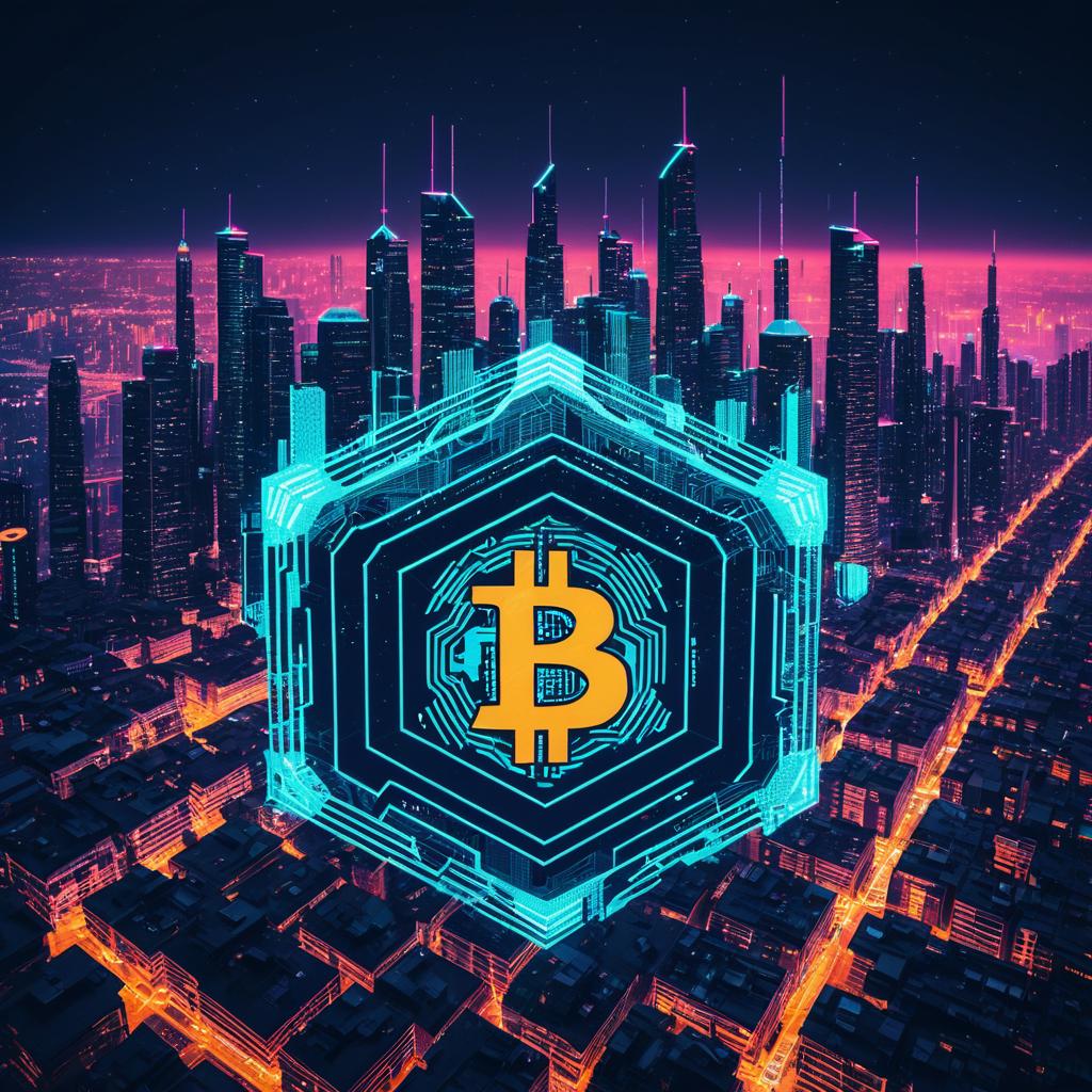 Artwork of bitcoin logo reimagined as a futuristic cityscape, expandable hexagonal buildings shaped like the logo, shimmering augmented reality layers, set against twilight neon haze with floating data spheres, vibrant and dynamic