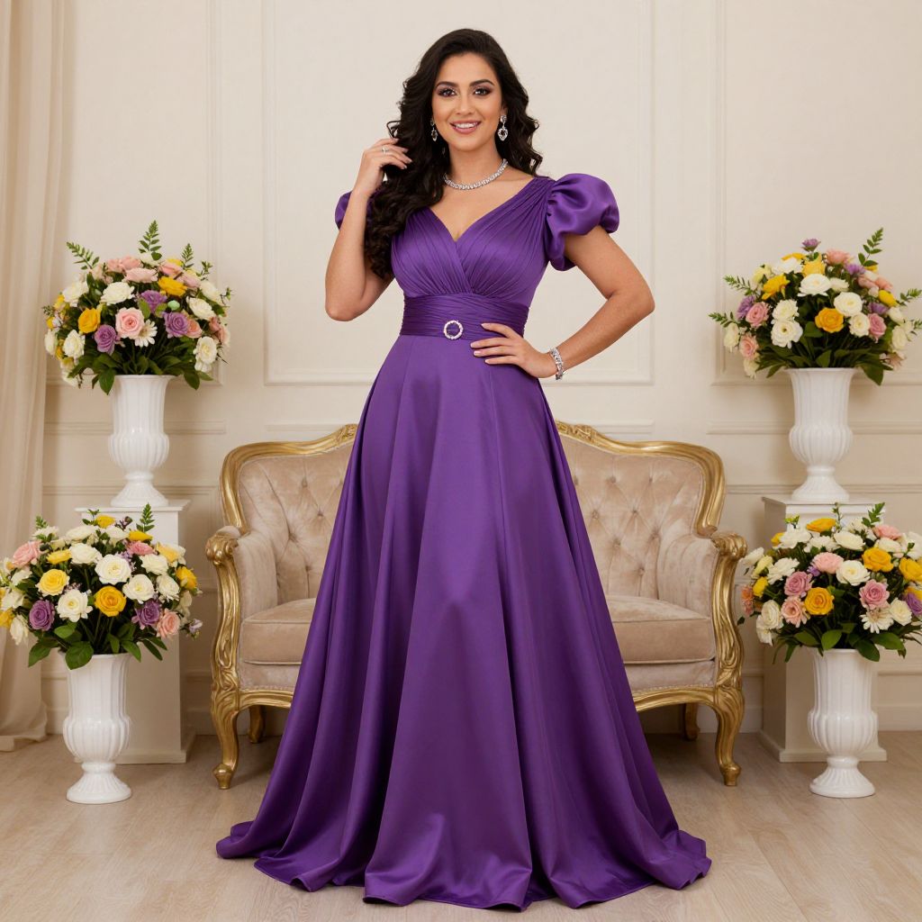 Photograph of a smiling woman with long, wavy black hair standing in an elegant room. She wears a vivid purple, floor-length gown with puffed short sleeves and a gathered waist, adorned with a silver belt buckle. She accessorizes with a pearl necklace and bracelet. Behind her, a beige, tufted, ornate chair is flanked by two tall white vases filled with colorful floral arrangements. The background features cream-colored walls with decorative molding. The woman's confident stance and bright smile convey a sense of elegance and grace.