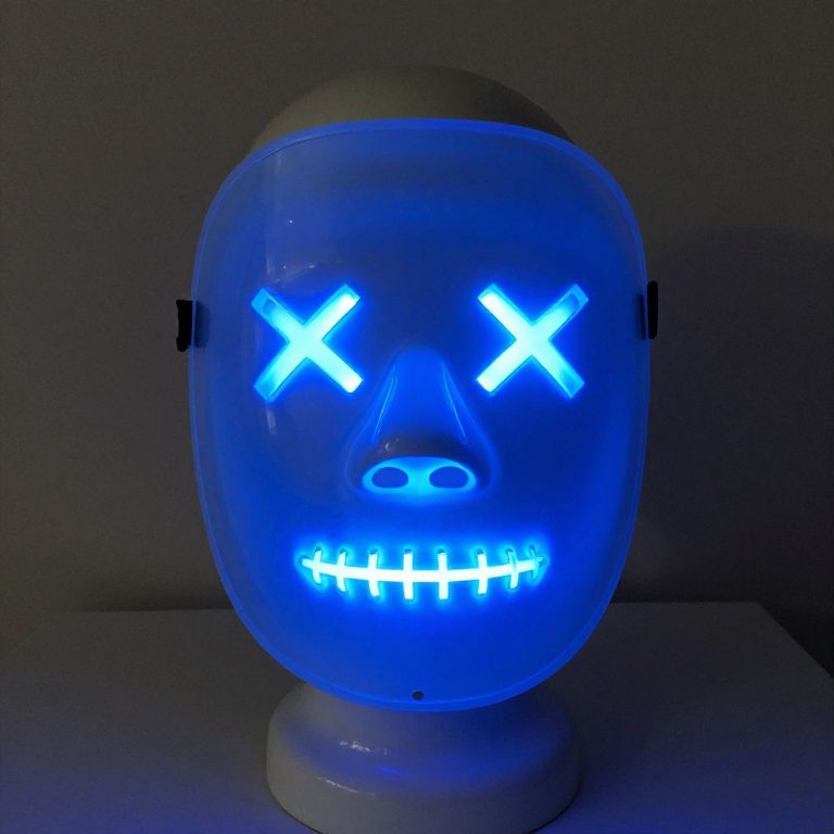 LED-lit Purge mask in vibrant blue hues displayed on a white mannequin head, featuring glowing X-shaped eyes and stitched mouth design.