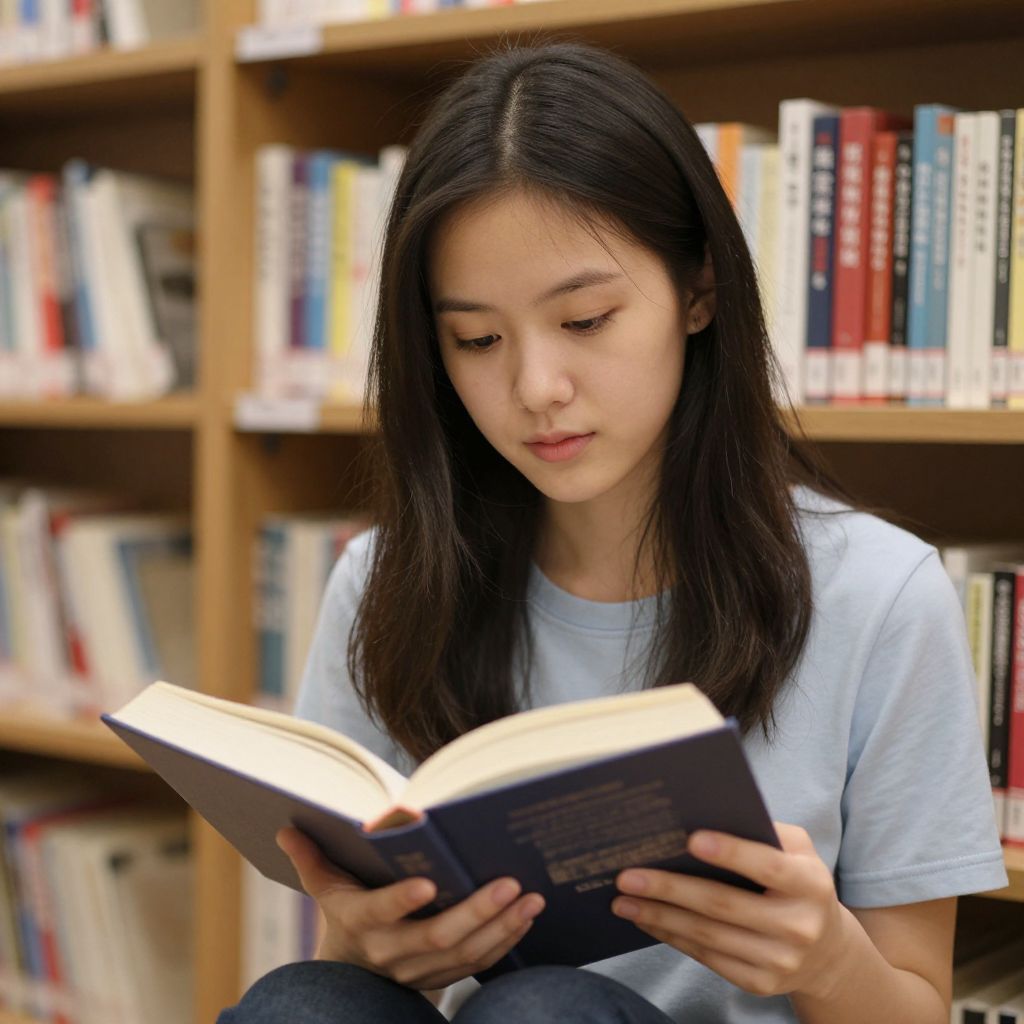Photograph of an Asian woman with long black hair, wearing a light blue t-shirt, sitting in a library, reading a book. Shelves filled