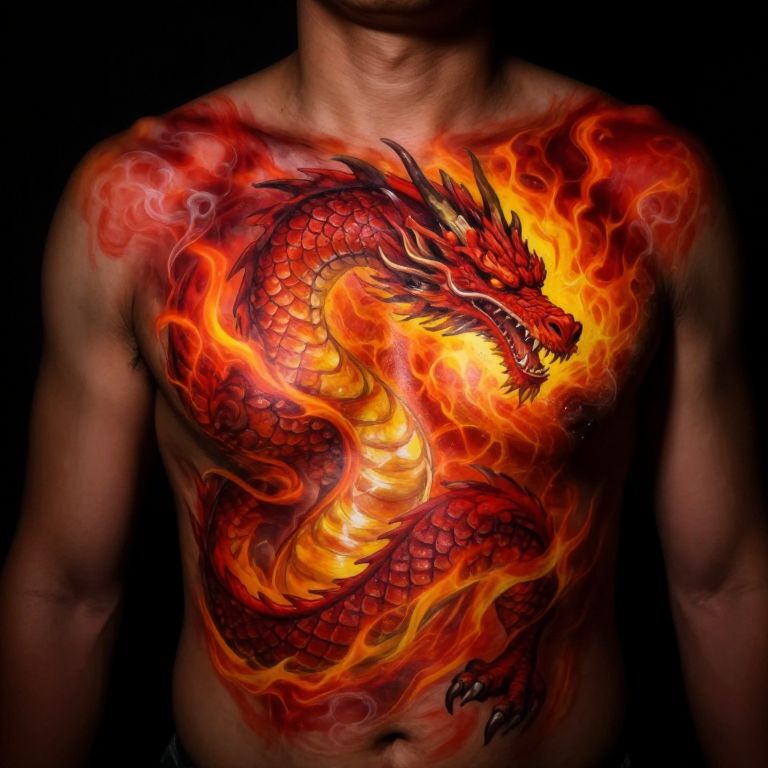 Photograph of a muscular man with a vibrant, fiery red dragon tattoo, featuring scales and flames, covering his chest and torso. Dark background highlights the