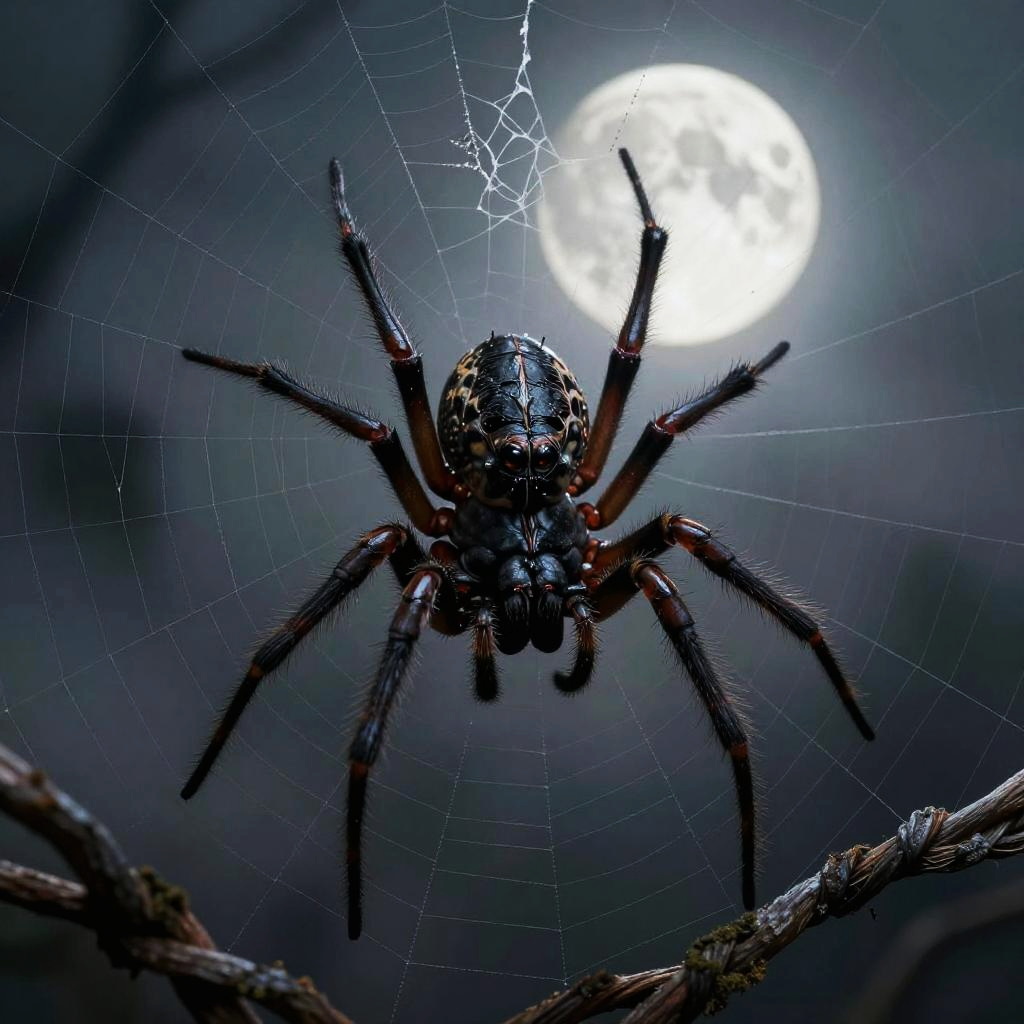 The bad guys spider perched on a twisted web, sinister expression, surrounded by fog and dim moonlight, hyper-realistic style with intricate details on spider's body, eerie and suspenseful mood, sharp focus on spider