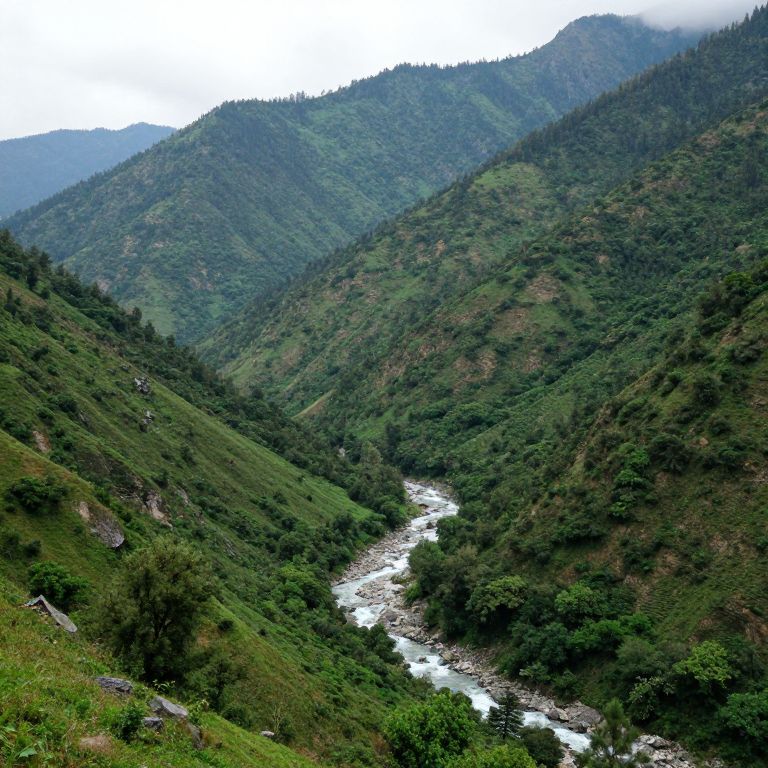 Green forested mountains with a small river running down a valley near Manali in Himachal Pradesh, India