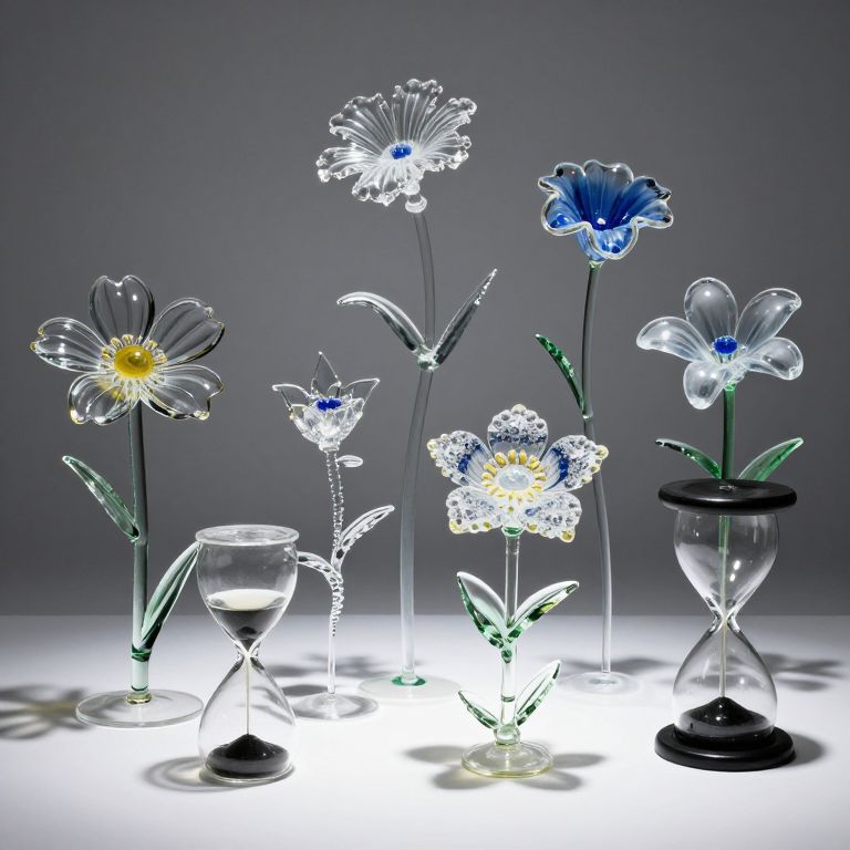 Photograph of six intricately crafted glass flowers and a glass hourglass, glowing against a dark gray background, showcasing clear, blue, and yellow hues