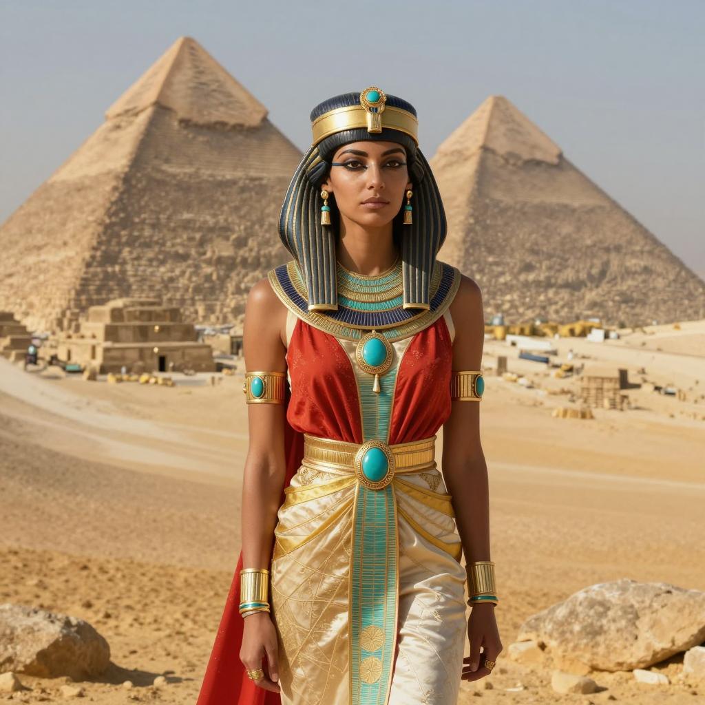 Egypt queen dress, photograph of a woman standing in front of pyramids, Ancient Egyptian style, wearing a colorful, sleeveless dress with red, gold, and teal patterns, gold necklaces and bracelets, large turquoise pendant, gold headpiece, dark hair in updo, serious expression, desert background with rocks and pyramids, realistic, detailed, warm sunlight, historical reenactment, cinematic style