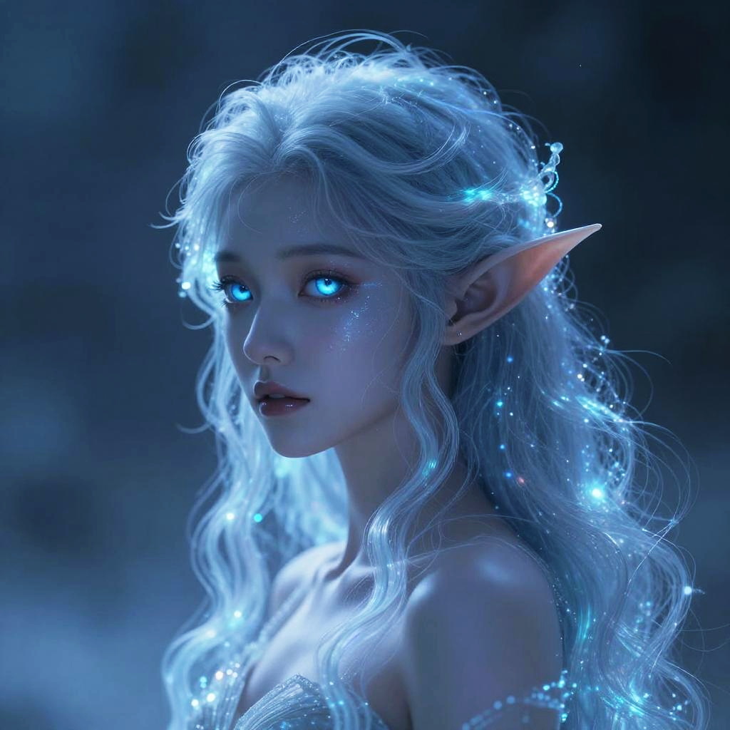 AI fantasy portrait generator creating a mystical ethereal character with shimmering iridescent skin, glowing eyes, and intricate cybernetic tattoos in a futuristic enchanted forest, soft ambient lighting and surreal magical atmosphere.