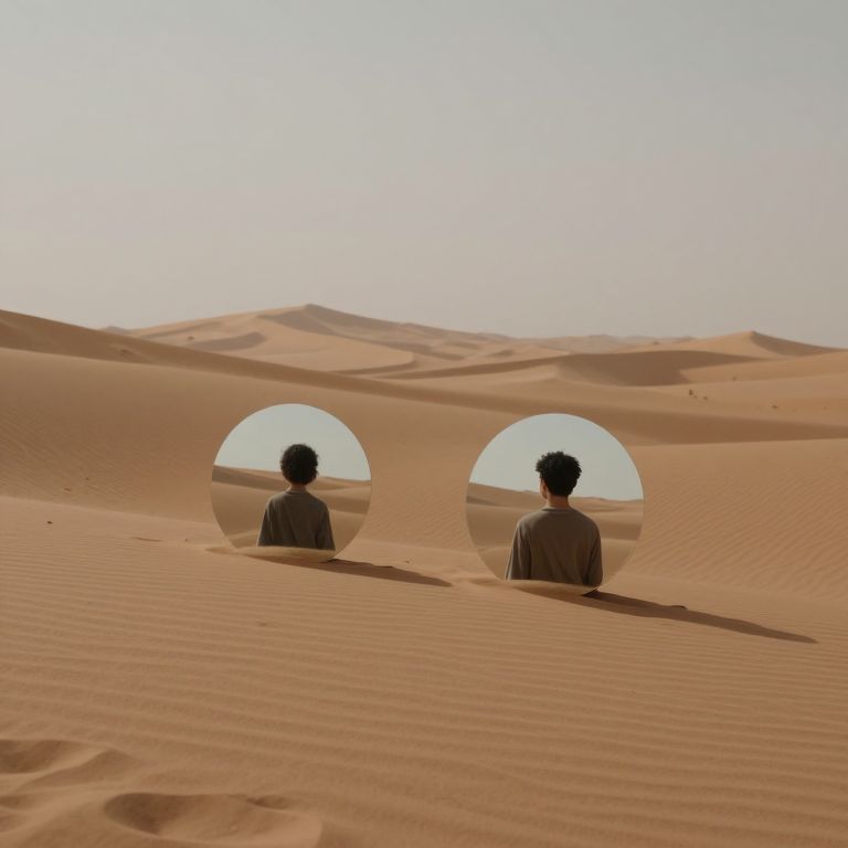 In a surreal desert expanse, mirrored reflections dissolve the boundaries between self and other, evoking a profound sense of duality and existential contemplation amidst the quiet hum of solitude and the endless dance of shifting sands.