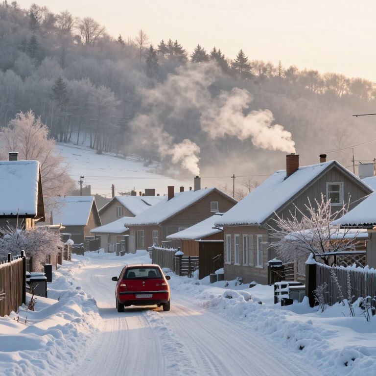 Photograph of a snowy suburban street at sunrise, with a red car driving away from the camera. The street is lined with small, brown, wooden houses with snow-covered roofs. Smoke rises from several chimneys, creating a misty effect in the cold air. Bare trees and bushes are dusted with snow on either side of the road. The background shows a gentle hill covered in snow, with sunlight casting a soft glow over the scene. The sky is bright but clear, adding a crisp, wintry feel to the image.