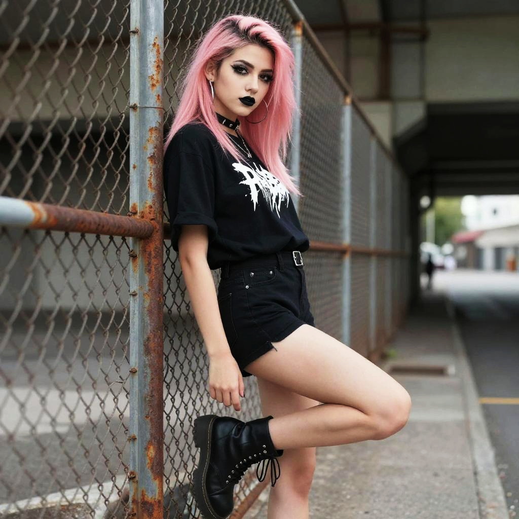 Photograph of a punk-rock inspired young woman with pink dyed hair, black lipstick, and heavy eye makeup. She's leaning against a rusty chain-link fence in an urban, underpass setting. She's wearing a black oversized T-shirt with a white graphic, black high-waisted shorts, and black combat boots. Her left leg is bent at the knee, and she's looking directly at the camera with a confident expression. The background is slightly blurred with industrial elements.