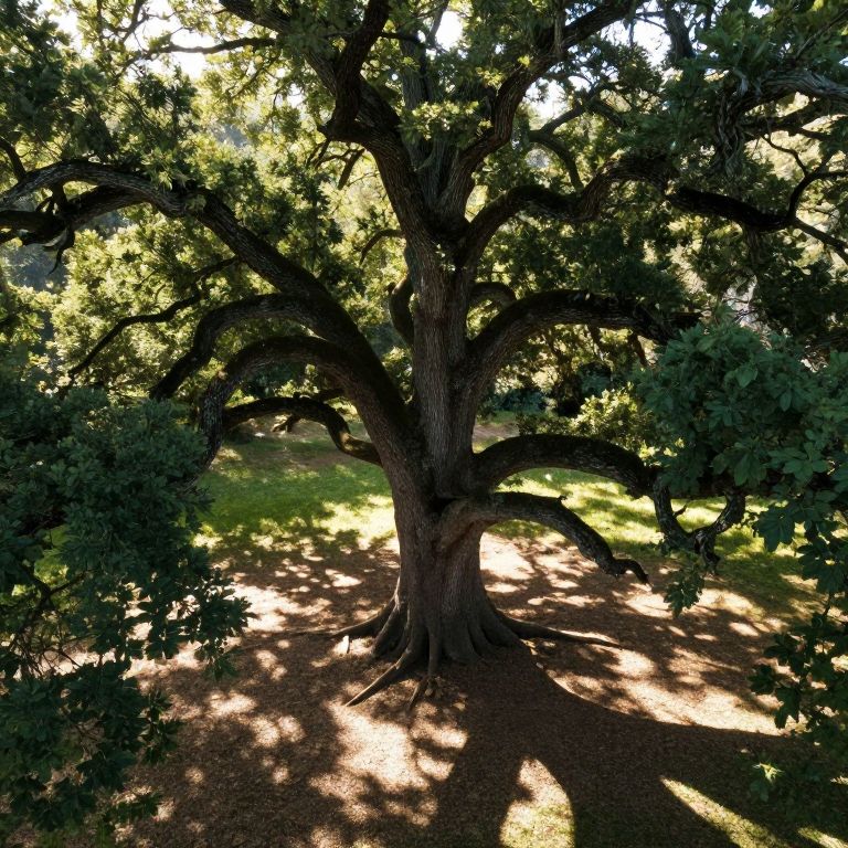 An aerial perspective reveals a tranquil valley bathed in golden sunlight, with an imposing ancient tree standing proudly amidst a lush wildflower meadow. The scene harmoniously merges the grandeur of nature's beauty and the serene solitude of this awe-inspiring arboreal guardian. In the spirit of Georgia O'Keeffe, the image emphasizes an enlarged central focal point, featuring intricate details of the tree's textured bark and vibrant, colorful blooms in various stages of development. The radiant sunlight elongates shadows across the field, accentuating the delicate patterns formed by petals and leaves while a gentle, atmospheric haze lingers in the distance, fostering a sense of calm reflection and introspection within the viewer.