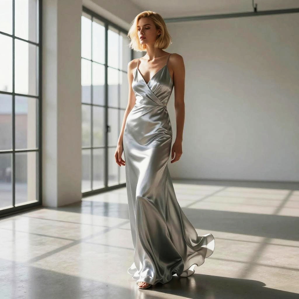 Photo of a elegant blonde woman with sleek bob haircut in sunlit minimalist loft with large windows, wearing flowing silver silk gown. Cinematic rim lighting, glossy highlights, crisp contrast, reflective floor, leading lines, editorial realism, clean minimal palette, empowering stance, dynamic composition, subtle bokeh, razor-sharp detail, premium studio vibe.