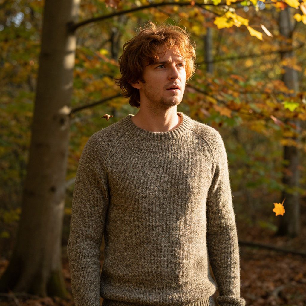 Chestnut hair man standing in a sunlit forest clearing, soft rays filtering through the autumn leaves, warm tones highlighting his expressive face, wearing a cozy knitted sweater, surrounded by vibrant foliage and falling leaves, cinematic and natural lighting.
