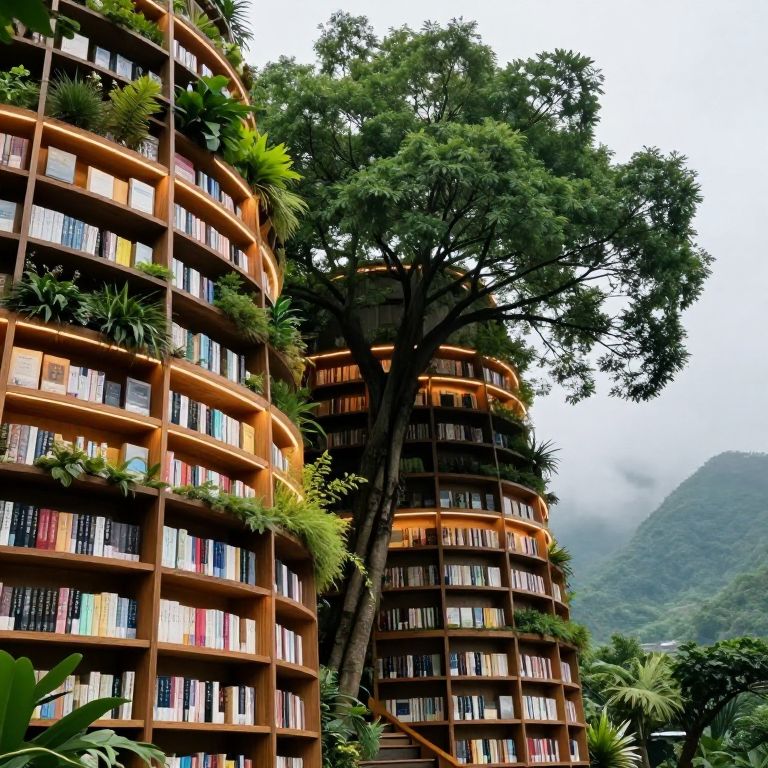 Photograph of two curved, multi-story library buildings with wooden balconies, each filled with colorful books. The buildings are surrounded by lush greenery, including tall trees with dense foliage. One tree stands prominently between the buildings. In the background, a mist-covered mountain rises, adding depth and a natural, serene ambiance to the scene. The wooden balconies and vibrant book spines contrast with the greenery, creating a harmonious blend of architecture and nature. The sky is overcast, casting a soft light over the entire scene.