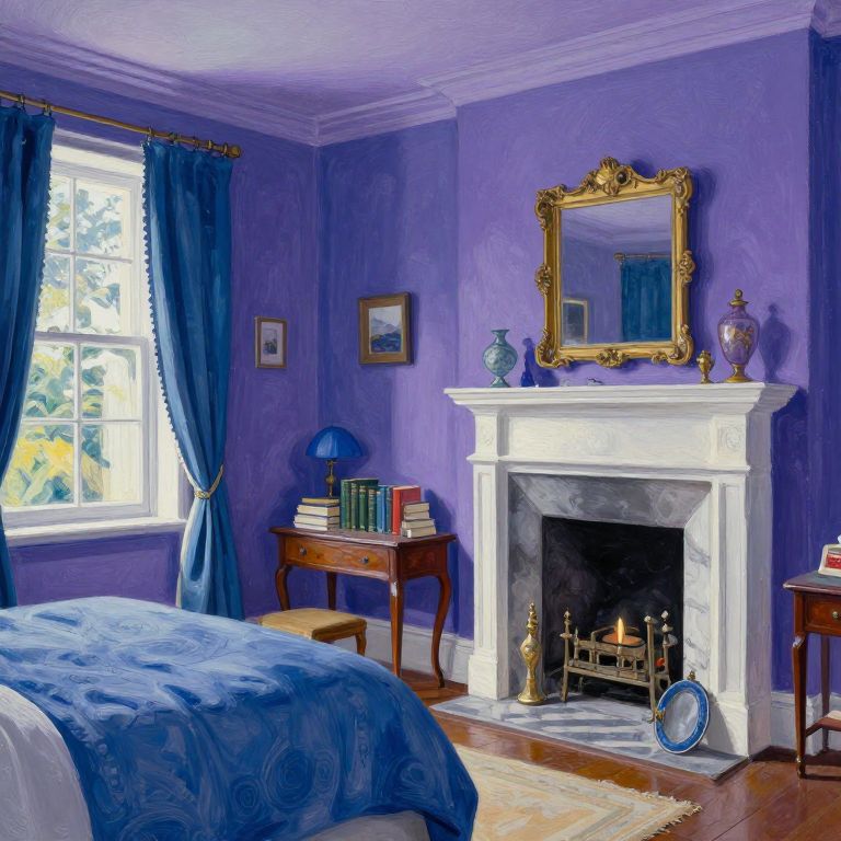 "Island gouache paint, saturated, blues and purples, bedroom in 19th century mansion, fireplace, dark and relaxing, books,"