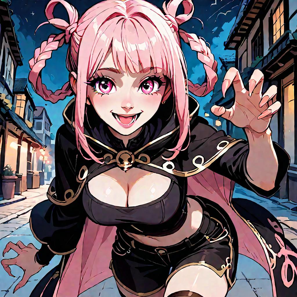 Score_9, score_8_up, score_7_up, 1other, solo, pink eyes, pink hair, long hair, sidelocks, side ponytail, bangs, hair bun, double bun, looking at viewer, smile, closed mouth, fur trim, bare shoulders, hair ornament, off shoulder, sleeveless, hand up, blurry, black jacket, long sleeves, from below, low angle, ground level, foot focus, good feet