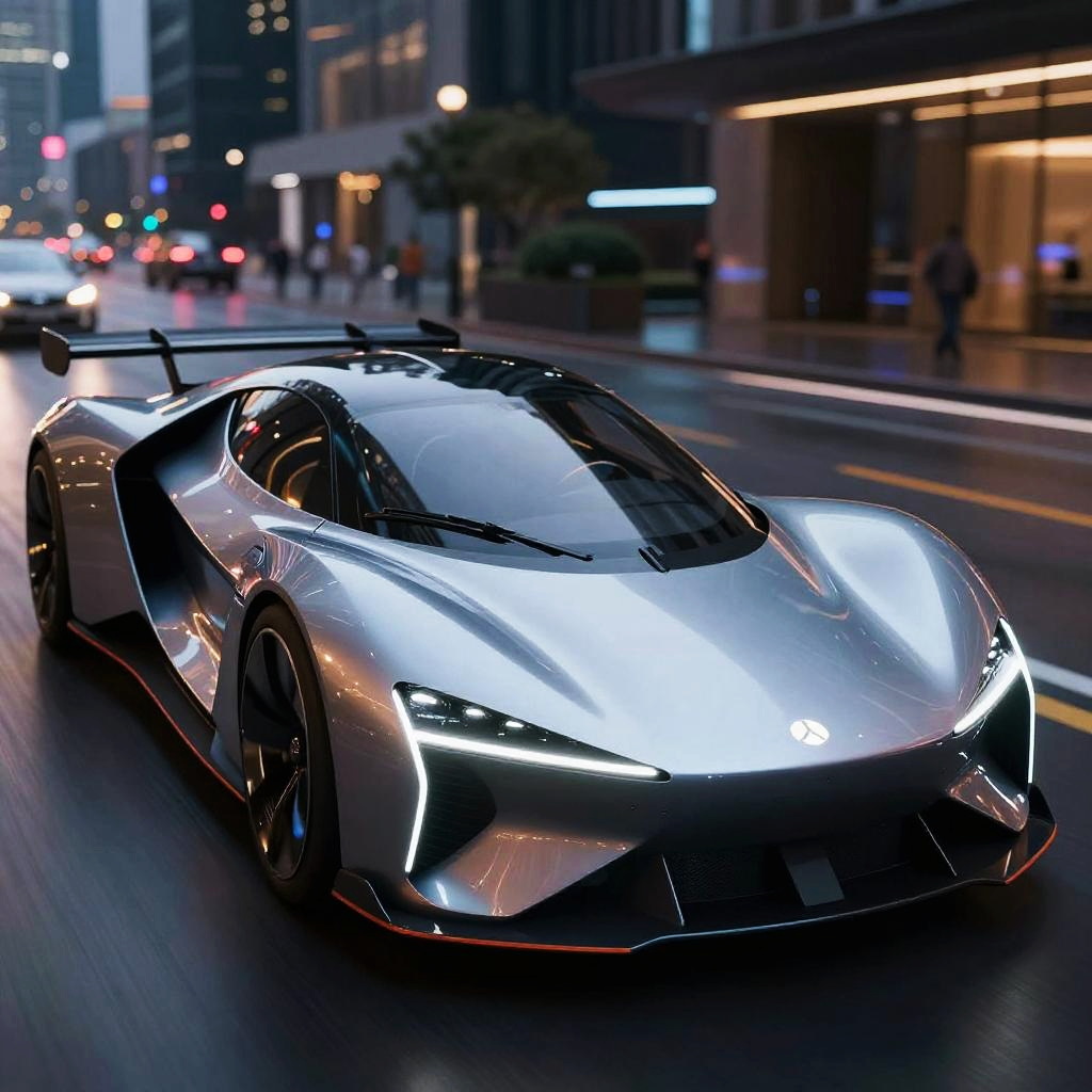 AI designed cars futuristic sleek aerodynamic shapes with smooth metallic surfaces, glowing LED accents, advanced autonomous features, set in urban night environment with neon reflections, high-tech city background, cinematic perspective, hyper-realistic details