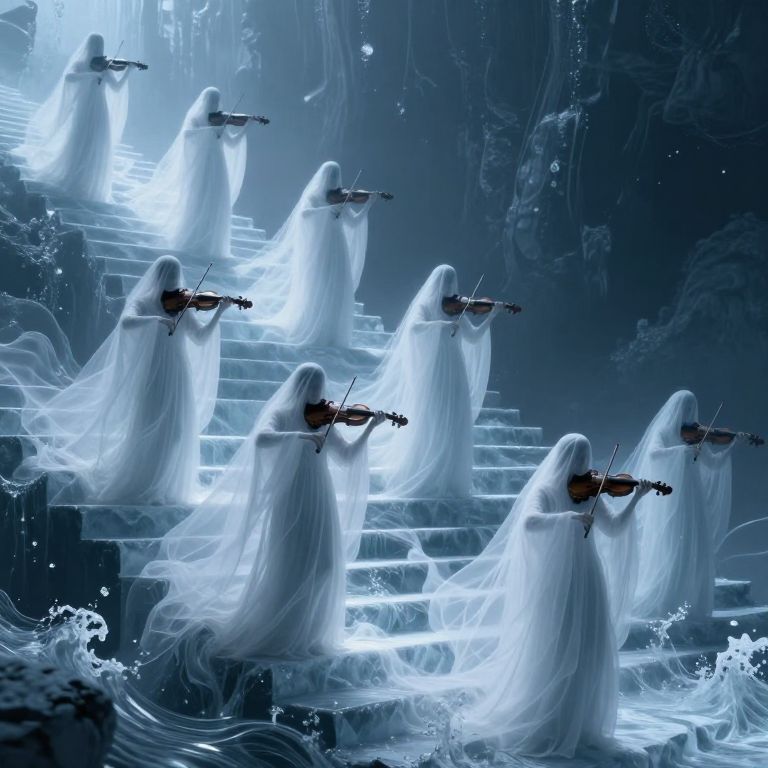 In a hauntingly ethereal digital artwork, ghostly figures draped in flowing white veils ascend an infinite cascade of icy steps, each musician's violin melody manifesting as shimmering waves that ripple through the surreal, otherworldly environment.