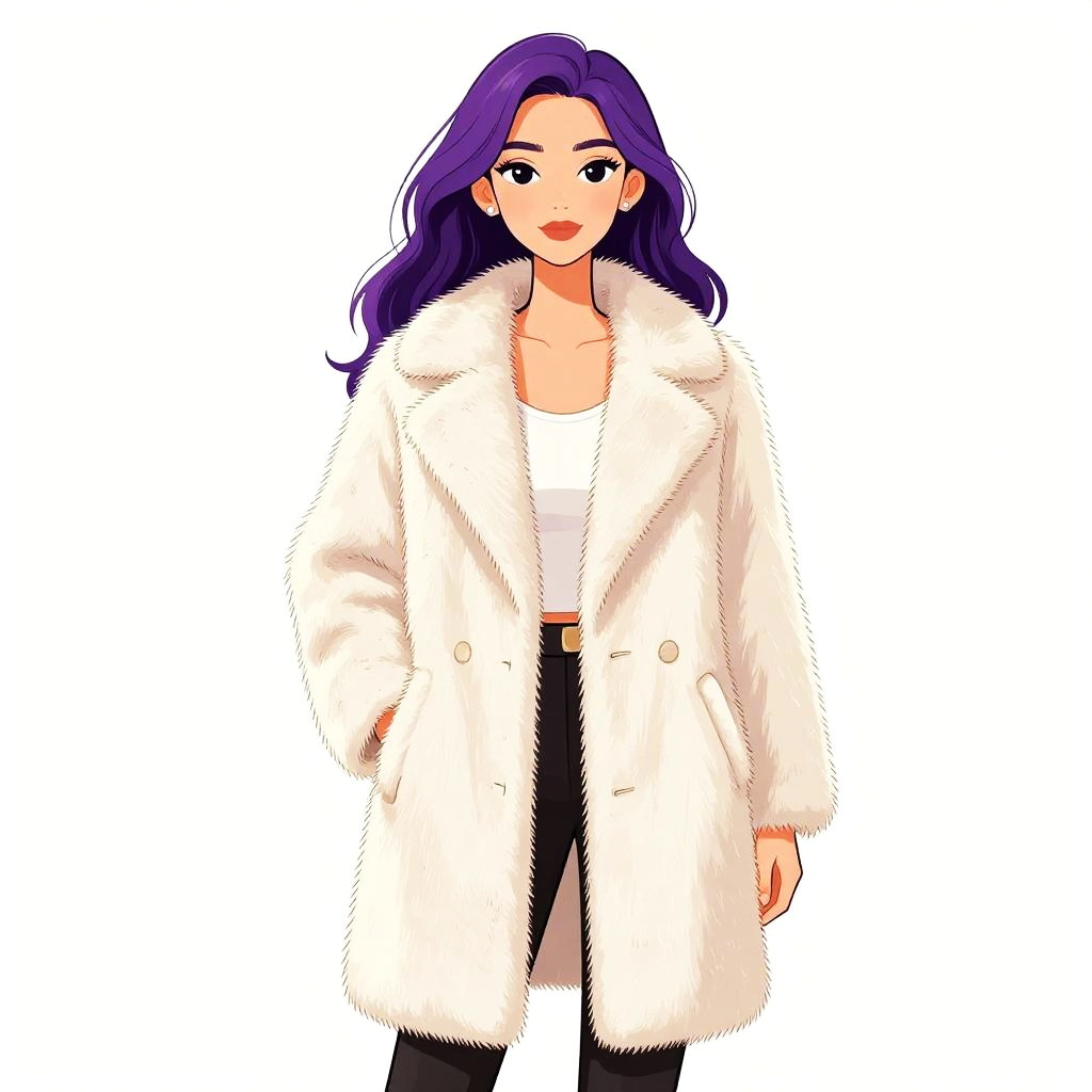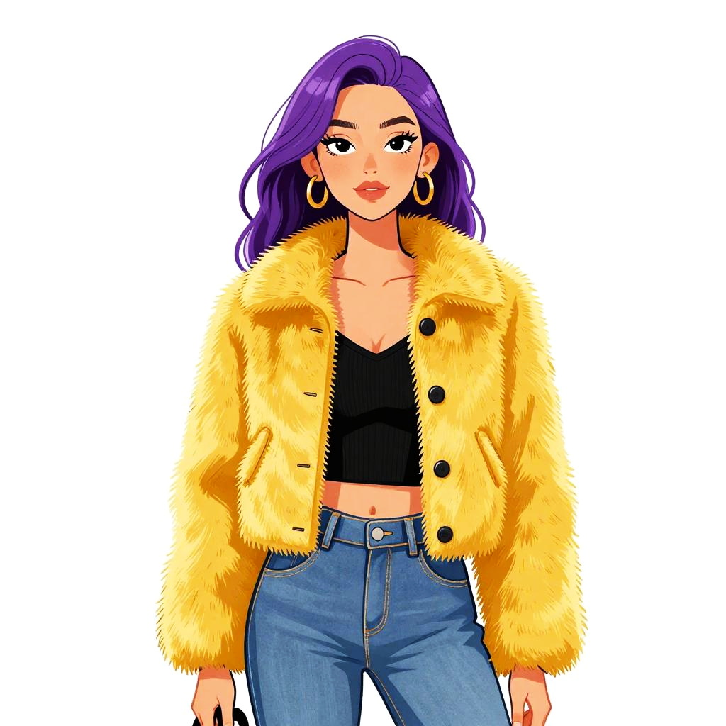 Woman with pretty face and pretty hair. Woman, casual chic, mustard yellow faux fur jacket, wide notched lapels, front button closure, chest and side pockets, cropped length, black knitted cropped tank top, high-waisted blue denim jeans, gold hoop earrings, white studio background. --sref 1467
