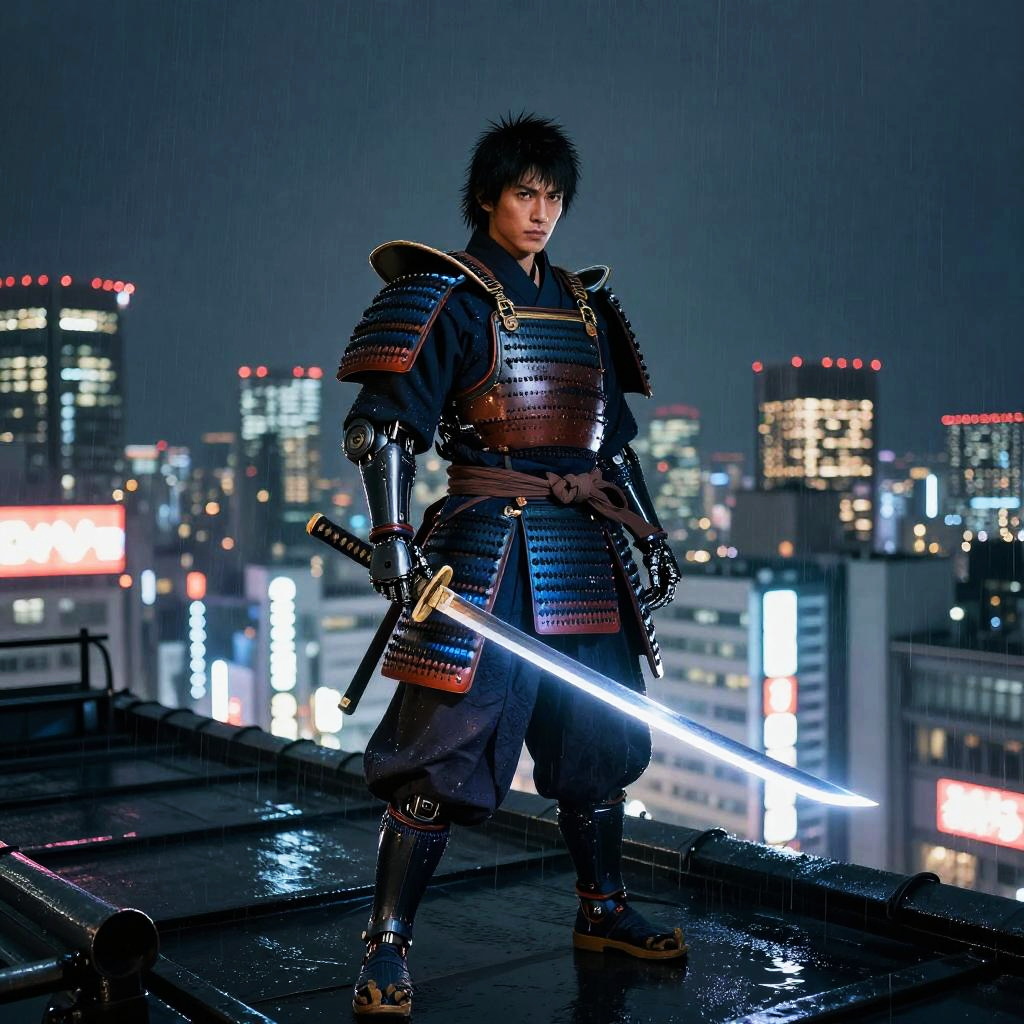 Tokyo_gh futuristic samurai standing on rooftop overlooking sprawling neon metropolis, traditional armor fused with cybernetic enhancements, glowing katana blade emitting intense light, night rain with reflections on metal surfaces, epic and heroic mood.