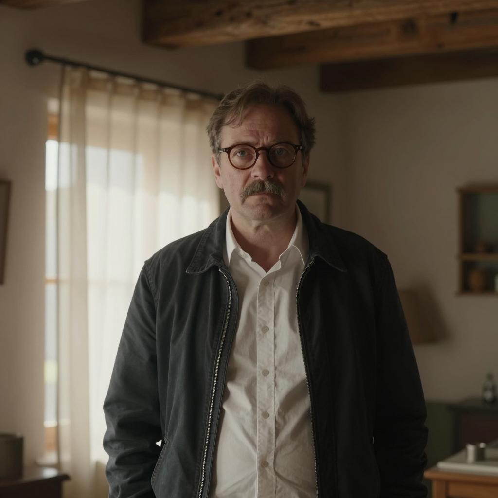 Middle-aged man with glasses, mustache, and short brown hair, wearing a dark jacket over a white shirt, stands in a dimly lit, rustic room with sunlight filtering through a sheer curtain. He is centered, looking forward. Wooden beams and ured walls in background.