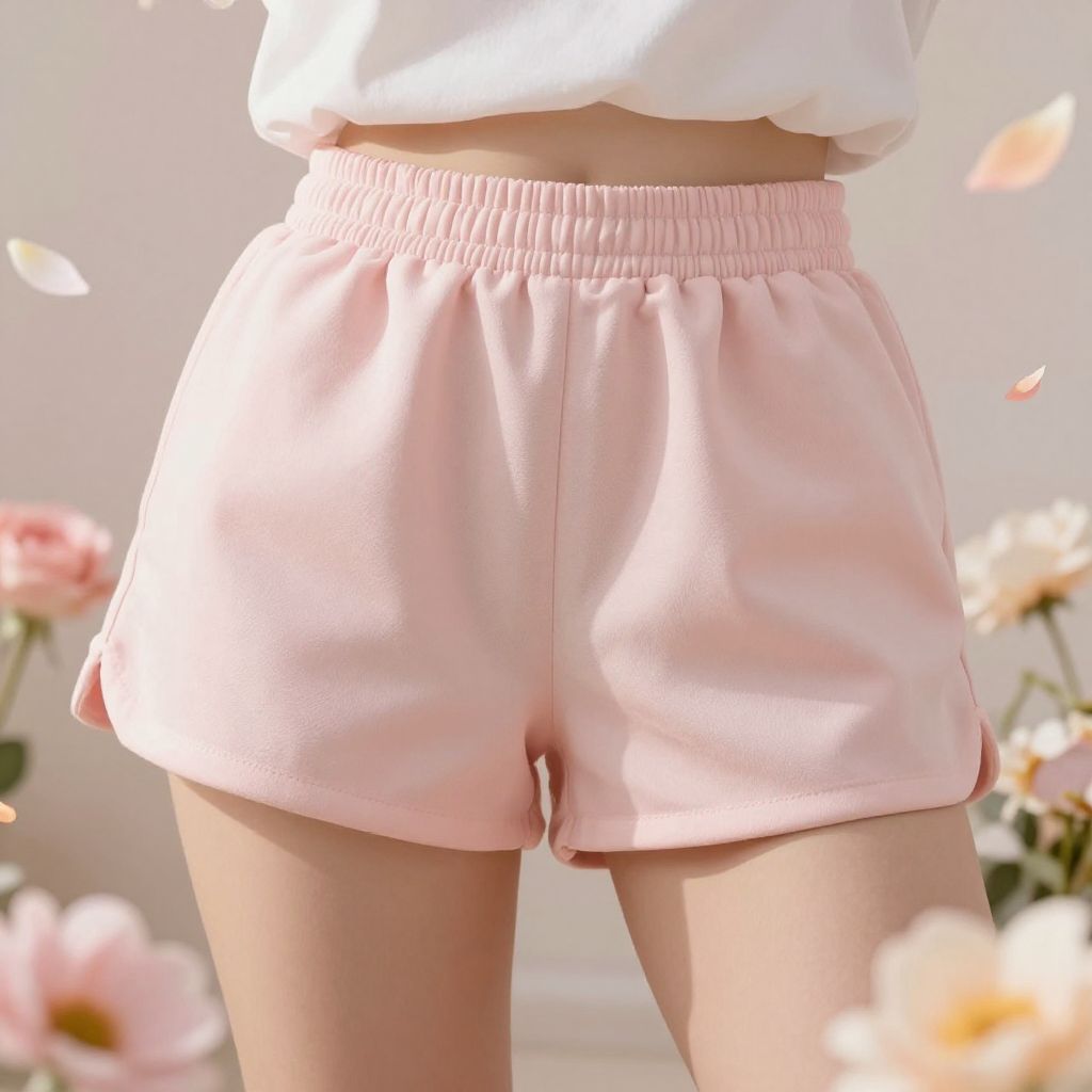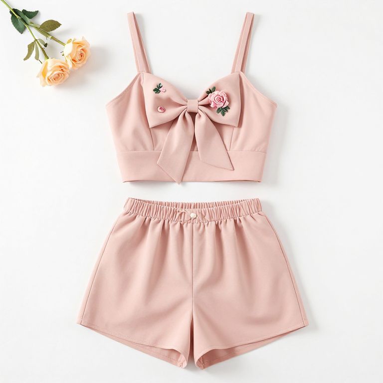 Two-piece women's outfit consisting of a light pink crop top with spaghetti straps, adorned with a large bow tie and rose appliques, paired with matching high-waisted elastic waistband shorts. Set displayed flat on a white background with two peach-colored roses placed to the side.