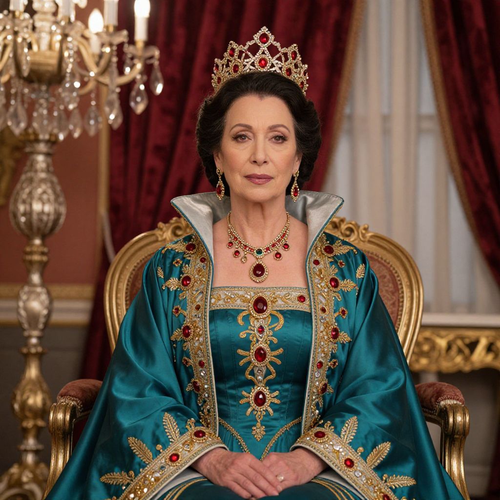 Cinematic portrait of a mature woman dressed as a queen, wearing a luxurious teal silk gown intricately embroidered with gold and red jewels. She is adorned with a jeweled tiara and matching necklace and earrings. The queen is seated in a richly decorated room with antique furniture, a crystal chandelier, and red velvet curtains. The soft lighting highlights her serene and commanding expression, emphasizing the graceful and sophisticated royal ambiance.