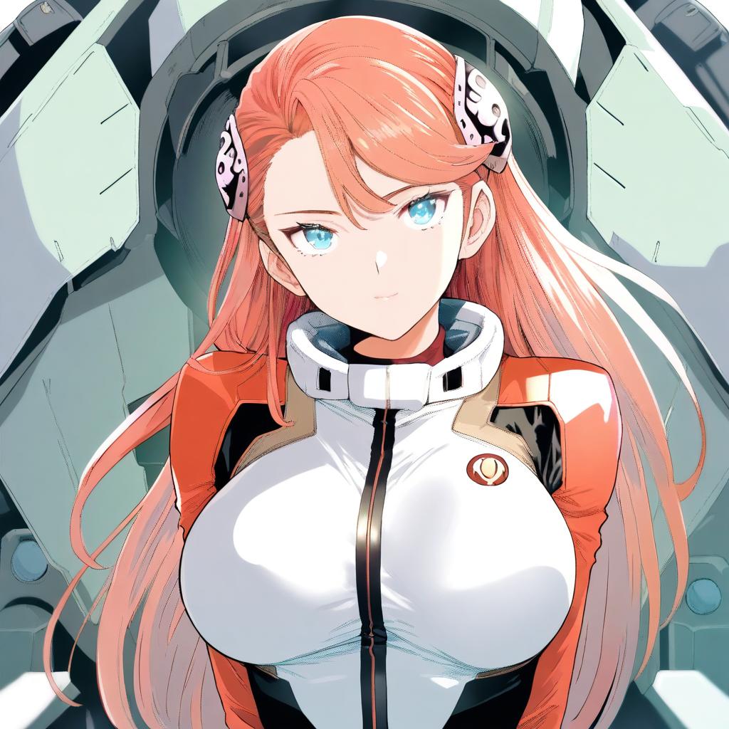 Aida rayhunton, gundam, 1girl, green eyes, long hair, orange hair, pink hair, red hair, hair ornament, large breasts, pilot suit, by artist lillly, animagine