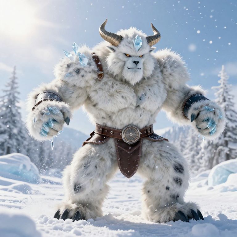 Vintage Car white fur monster with horns and leather armour, fists of ice, full body dynamic pose, snow, blizzard, ice, heroic, aggressive, sunlight, frost background, hyper-realistic,