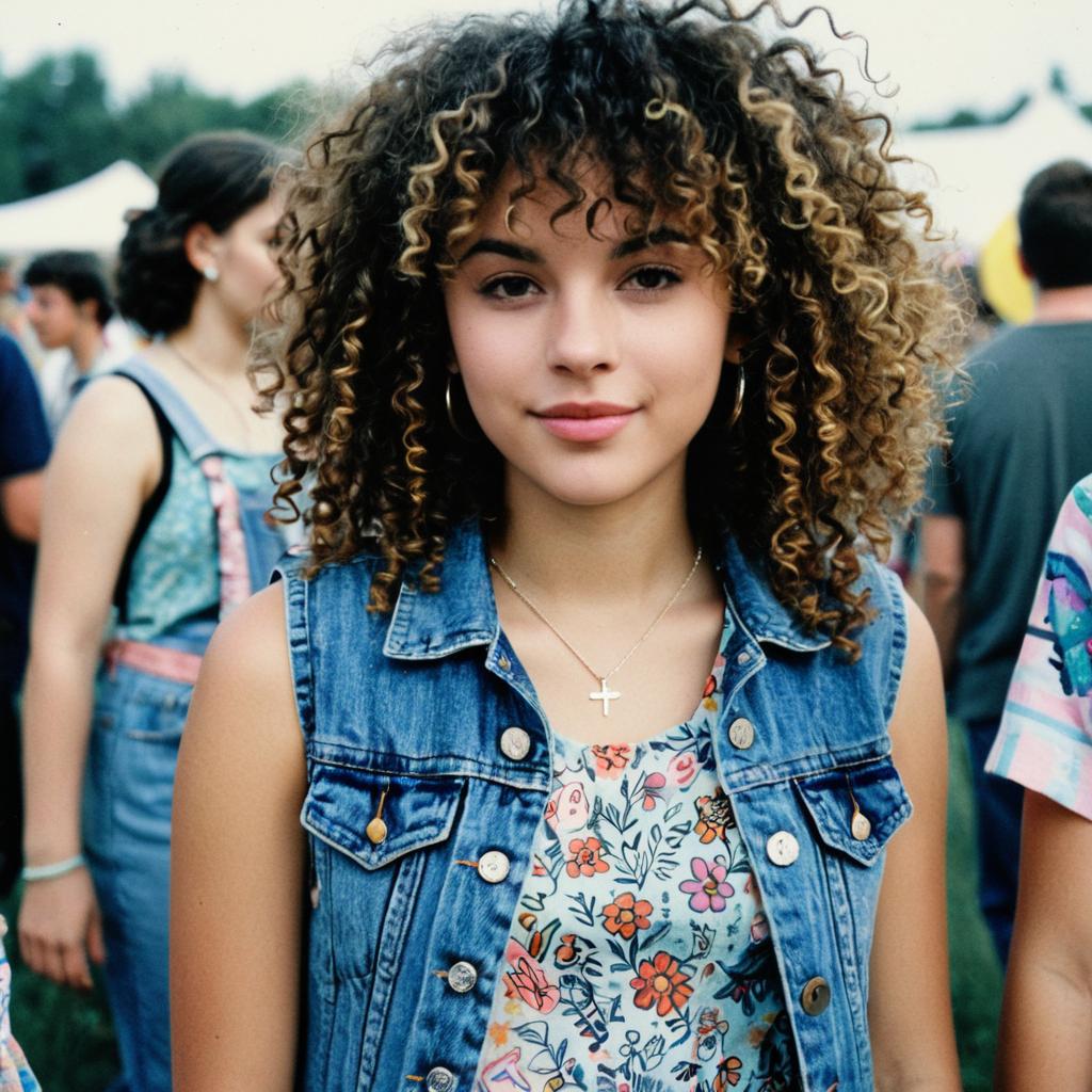 Photocopy scan of 2000s indie music festival photography, featuring teenage girl with curly hair wearing a floral dress and denim vest, with hand-drawn doodles and pastel overlays, realistic and nostalgic, neon accents, sharp focus, photorealism, 4k resolution