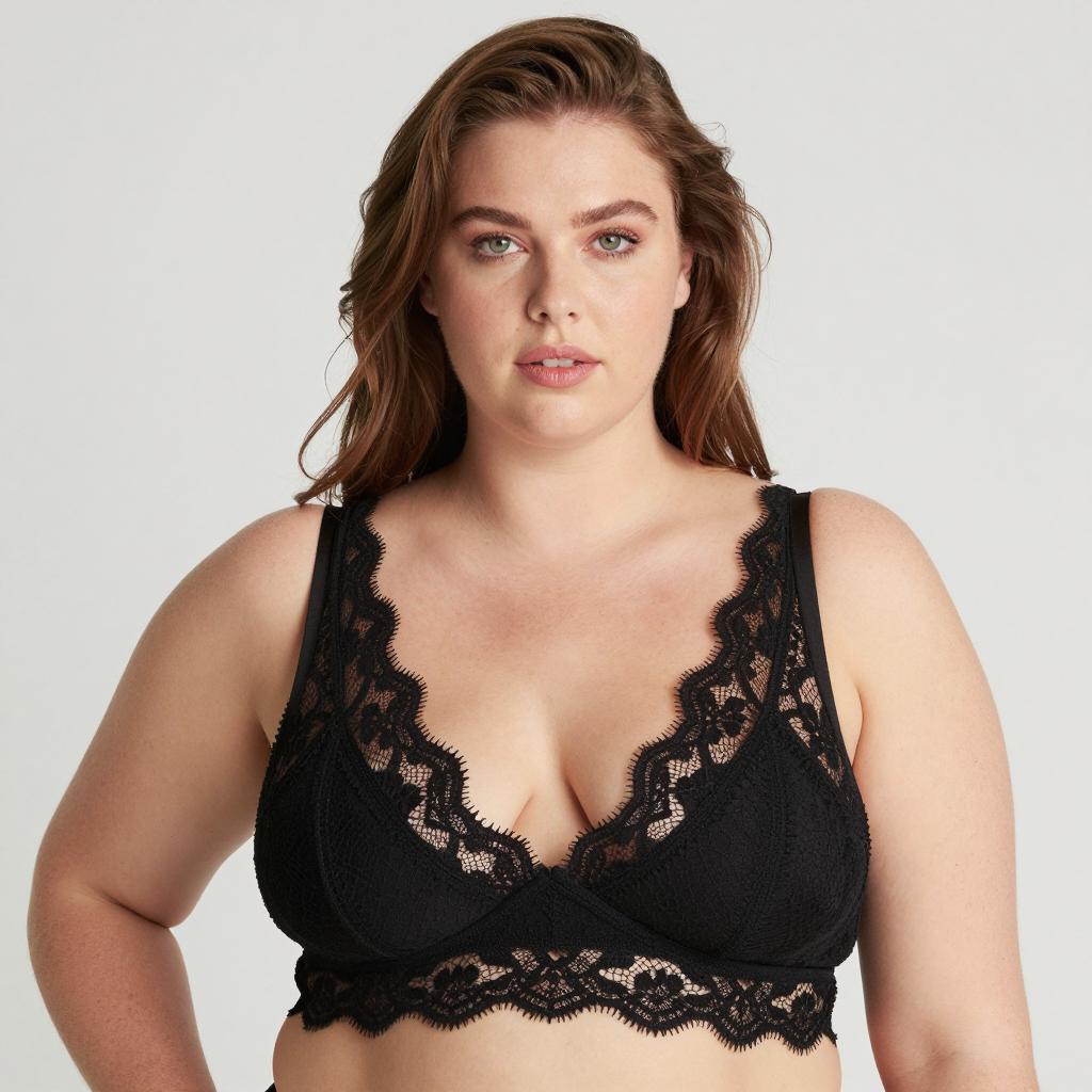 Photograph of a plus-size woman with light skin and long brown hair, wearing a black lace bralette with a deep V-neck. She has green eyes, light makeup, and a neutral expression. Her right arm is slightly bent, resting near her waist. The background is plain white.