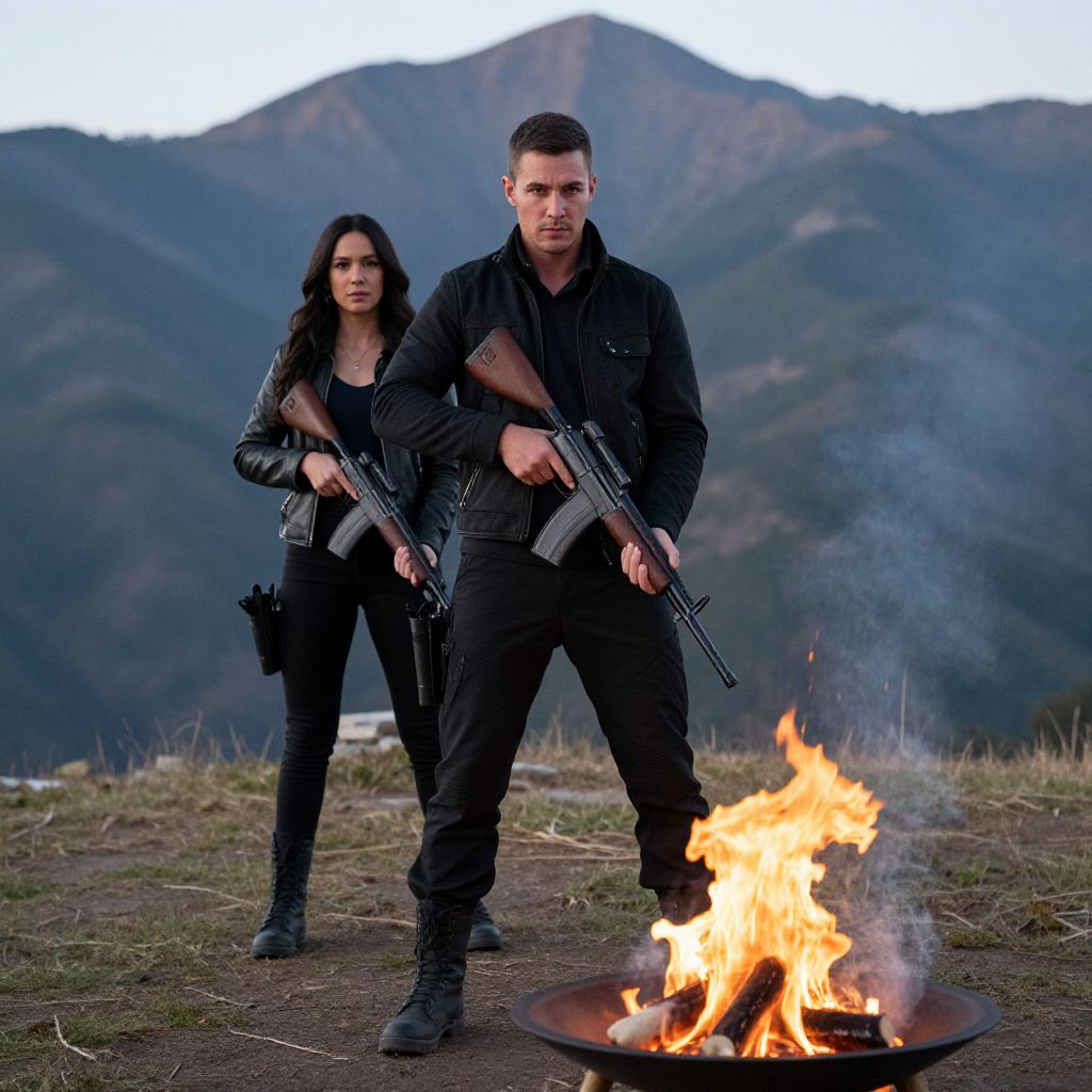 Photograph of three serious-looking individuals standing outdoors at dusk with a mountainous background. In the foreground, a muscular man with short dark hair and a trimmed beard, wearing a black leather jacket, black shirt, and pants, holds a rifle pointed downward while standing in front of a burning fire pit. His expression is focused. To his left, a young man with messy dark hair, wearing a green jacket and black pants, stands with a neutral expression. To the right, a woman with long dark hair, wearing a black jacket and pants, stands with a calm demeanor. The fire casts a warm orange glow.