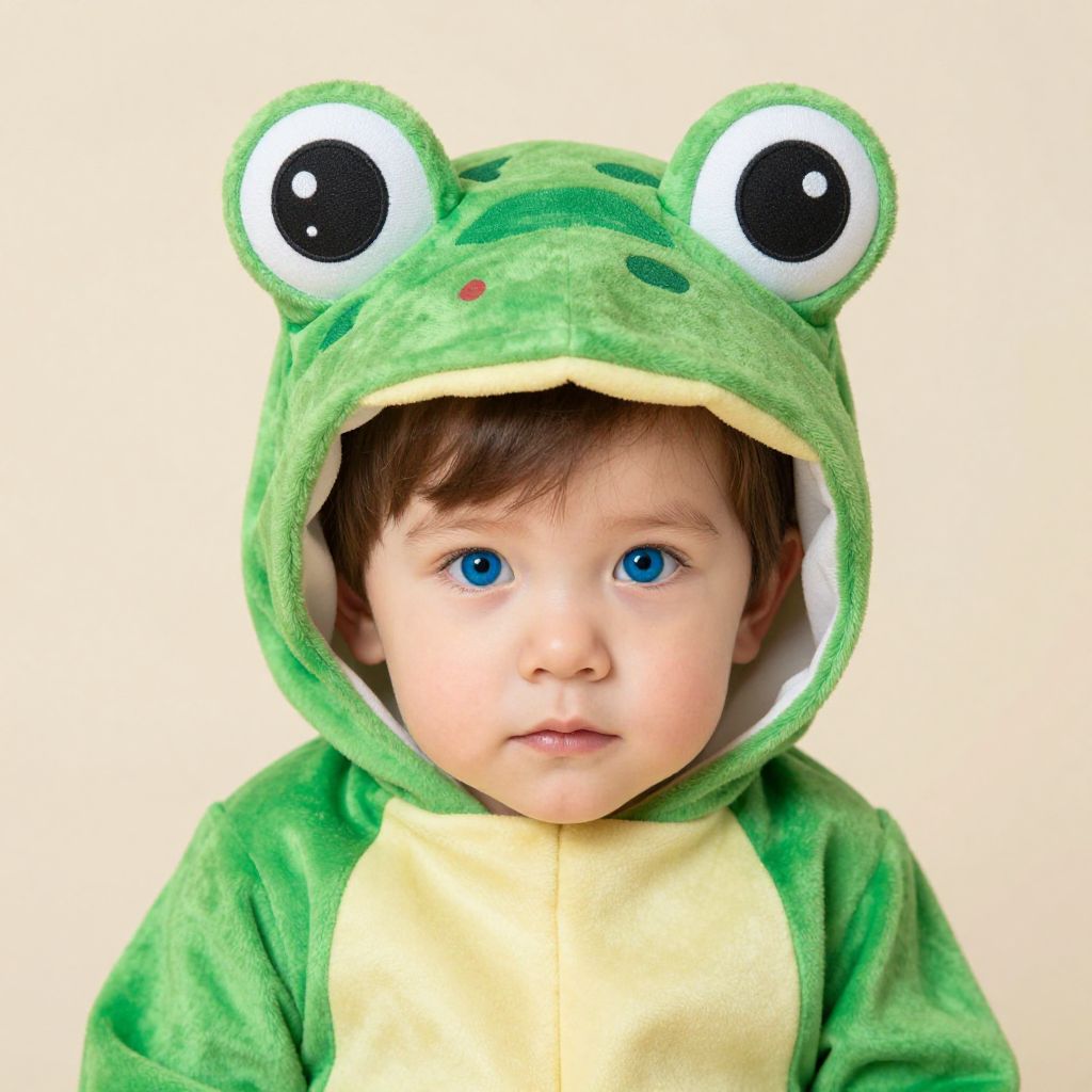 Photograph of a cute, fair-skinned baby with blue eyes, wearing a green and yellow frog-themed onesie with large black and white eyes on