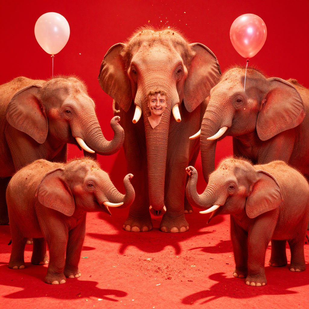 Vibrant, bold, redscale photograph captures a joyful moment: a smiling man surrounded by playful elephants, balloons and confetti scattered around them, bright sunlight casting long shadows, festive atmosphere, warm tones, vivid colors, whimsical composition, eye-catching details, nostalgic feel. Man has masculine face and piercing eyes