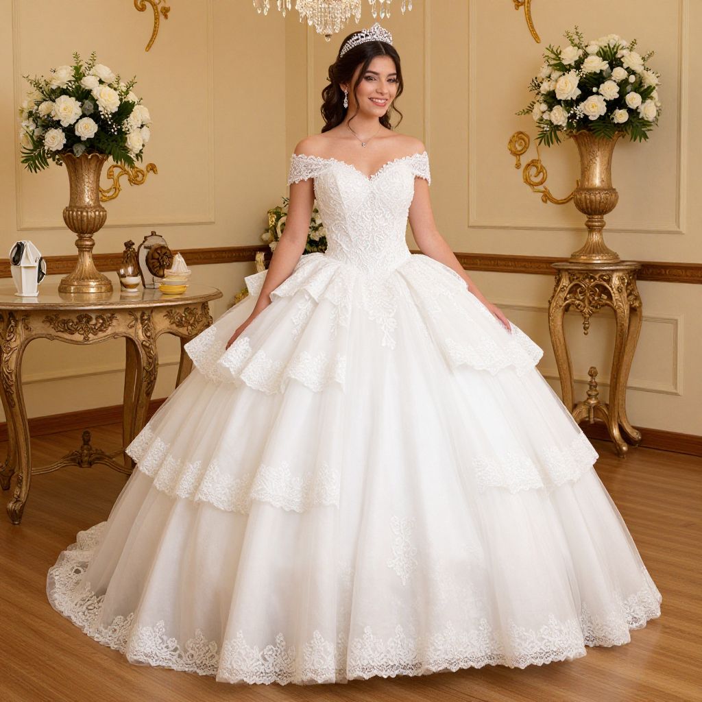 Elegant off-the-shoulder quinceañera dress featuring intricate lace detailing and a tiered tulle skirt, worn by a smiling young woman in a warmly lit room adorned with floral arrangements, a vintage-style table, and decorative gold accents.