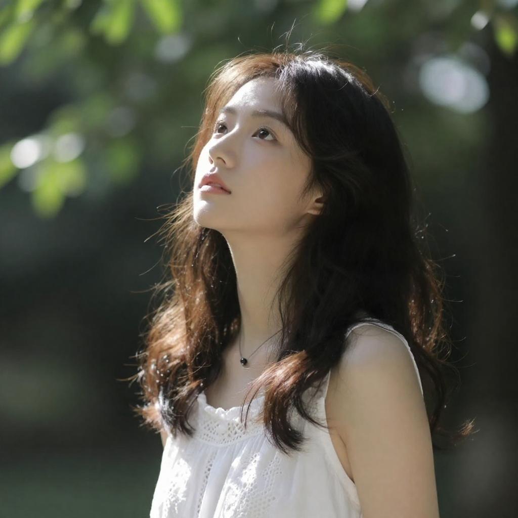A young woman with closed eyes enjoying sunlight outdoors, serene expression on her face, natural lighting highlighting her features, soft focus background with green foliage and blurred natural environment, wearing a simple grey shirt, peaceful and calm atmosphere