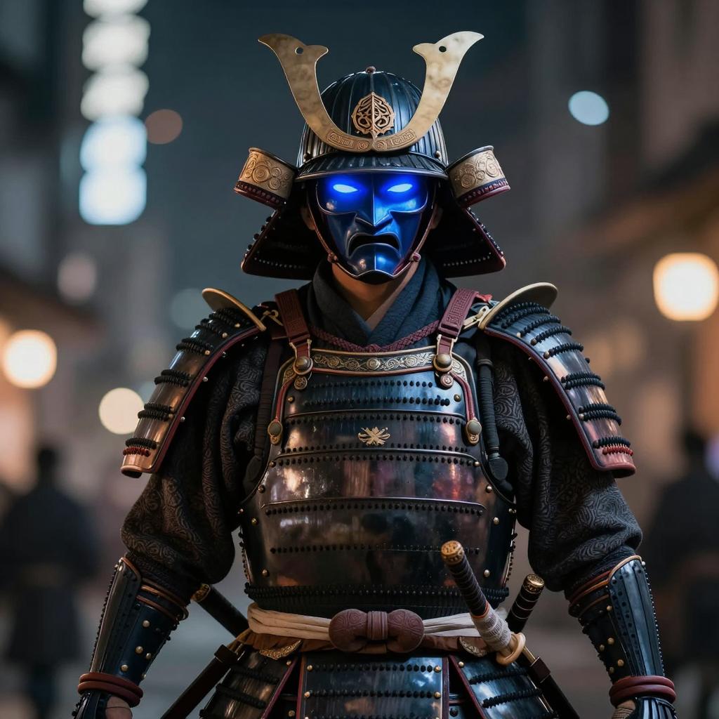 Samurai in detailed, dark blue and purple armor with metallic ure, wearing a helmet with antler-like protrusions. Dark scarf wraps around neck, brown sash at waist. Blurred city lights in background with vertical light fixtures. Sword sheath on back. Digital illustration with a realistic style. Samurai's face obscured by helmet.
