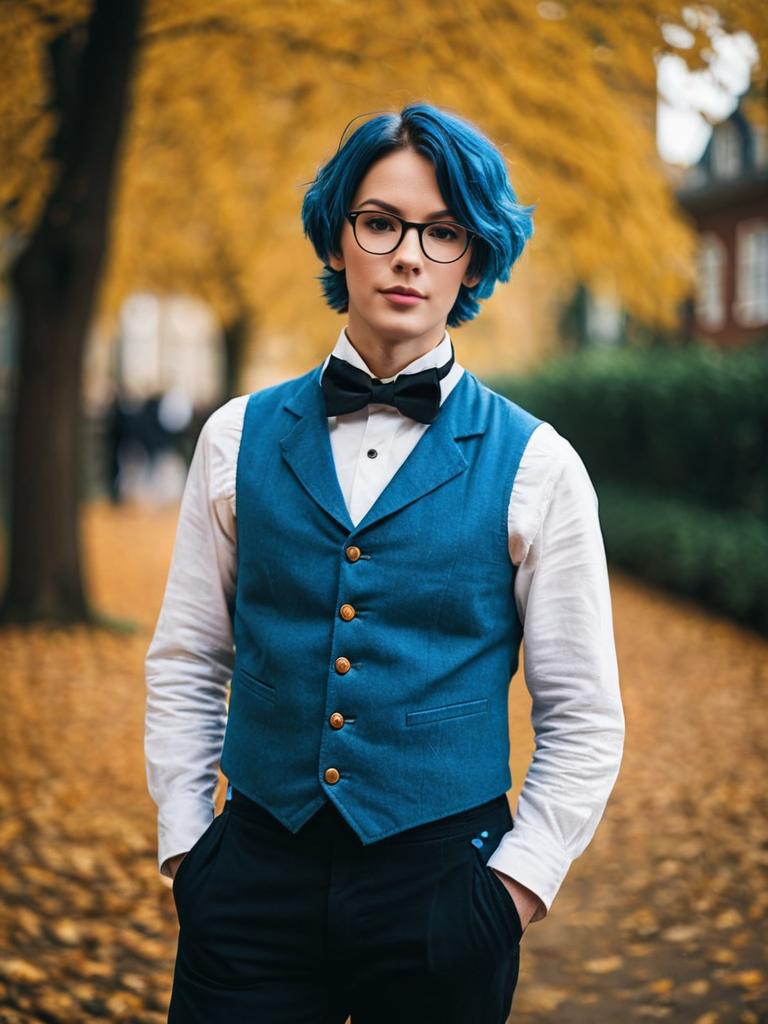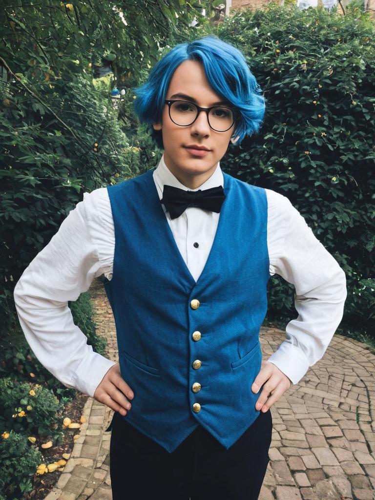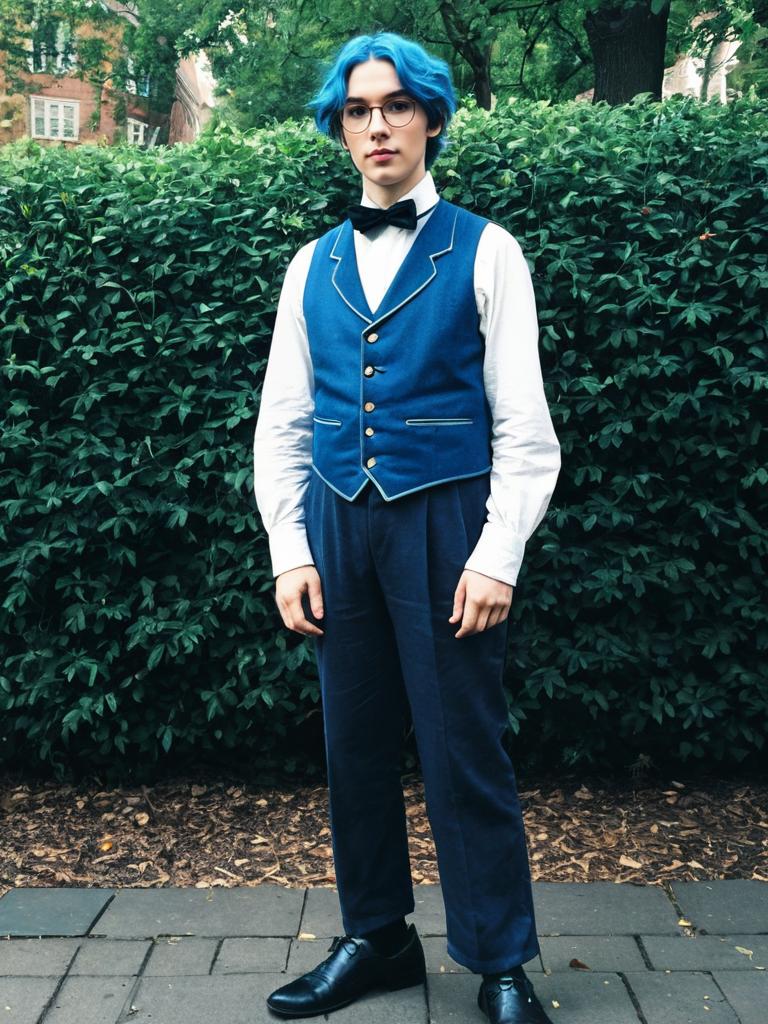 Photo-realistic cosplay photo of person in hans christian andersen (fate) costume. Full body. Standing. Full length. 1boy, blue eyes, glasses, blue hair, short hair, vest, long sleeves, bowtie