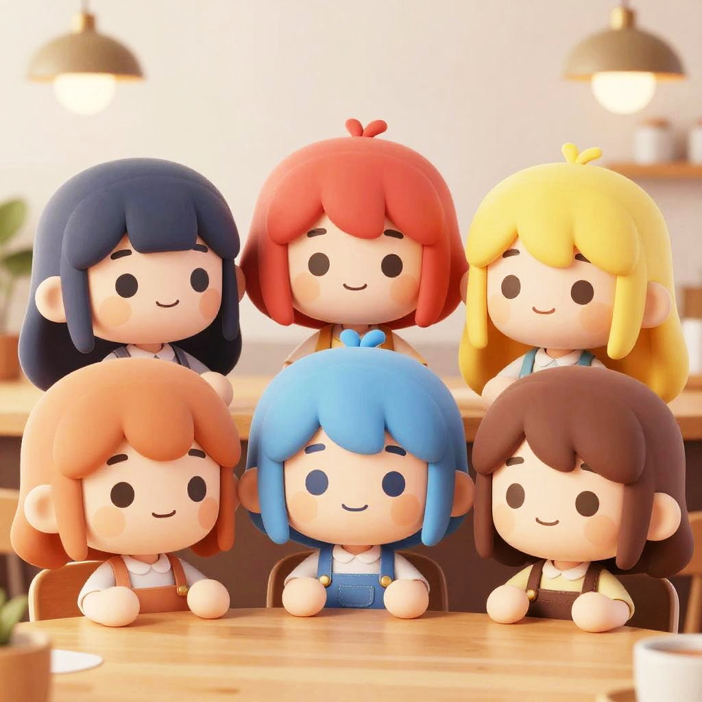 Cartoon characters with colored hair sitting together in a cozy café, soft pastel color palette, diverse hairstyles in reds, blues, yellows, warm lighting, cute and friendly expressions, detailed textures