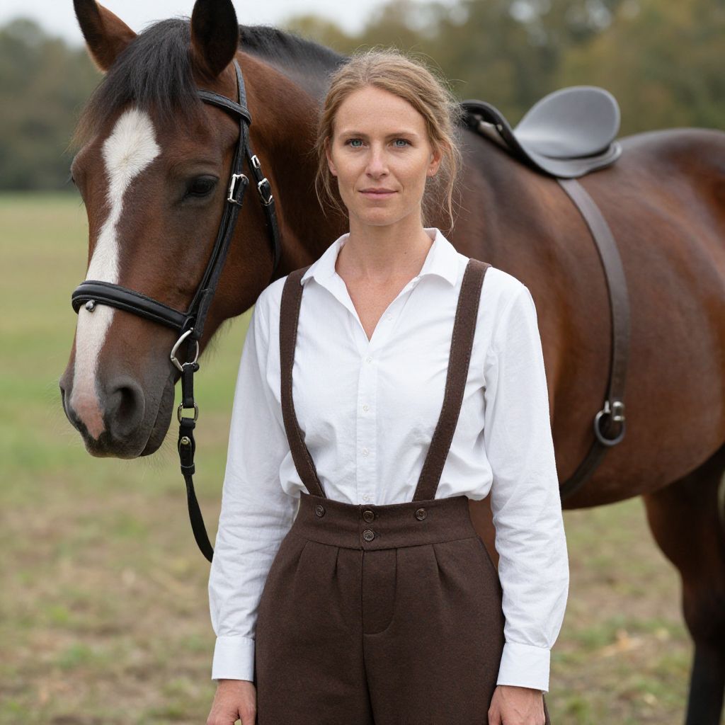 Photograph of a Caucasian woman with light brown hair in a loose ponytail, standing beside a dark brown horse with a white blaze on its face. She wears a white button-up shirt with dark brown suspenders and high-waisted brown pants. The horse is equipped with a black bridle and saddle. The background shows a grassy field with blurred trees and a cloudy sky. The woman has fair skin and a neutral expression, looking directly at the camera. The image has a natural, outdoor setting and the colors are earthy and muted.