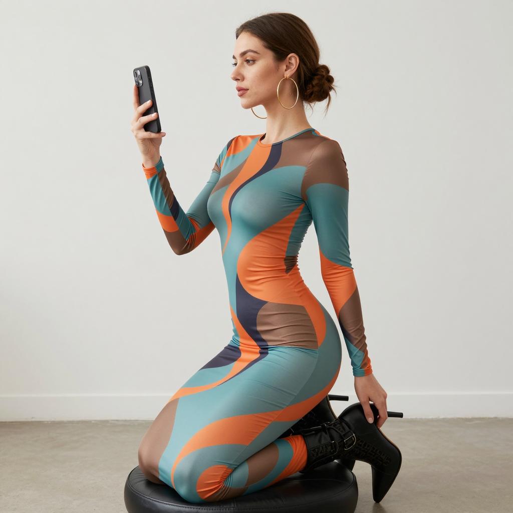 Woman kneeling on a black leather stool, wearing a long-sleeve, form-fitting dress with a colorful, abstract pattern of teal, orange, and brown. She holds a smartphone in her right hand, wears large gold hoop earrings, and has brown hair in a bun. She is looking to the left. Black high-heeled boots with a ured pattern are on the floor beside her. White wall and light-colored floor in the background.