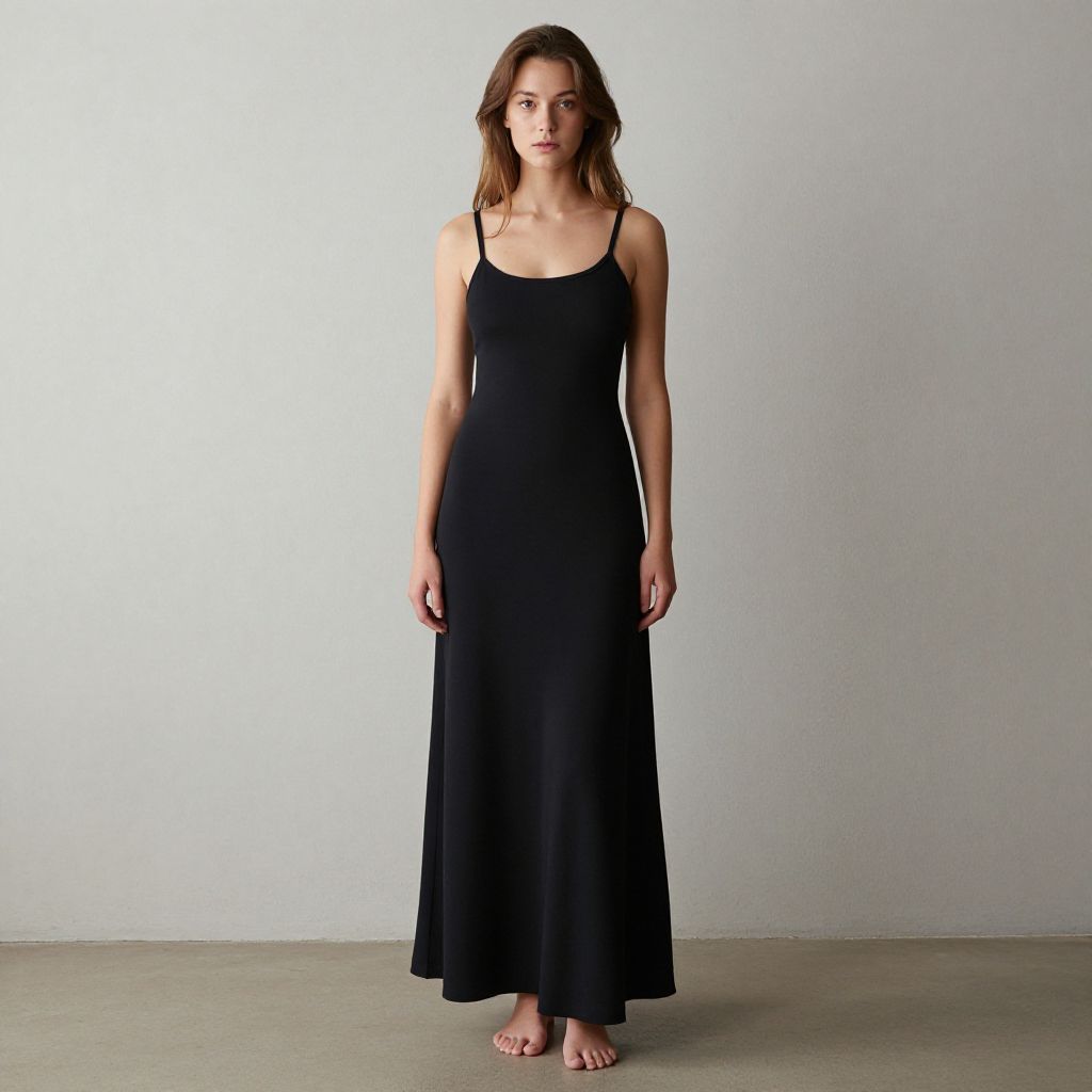 Photograph of a young Caucasian woman with long, wavy brown hair standing against a plain, light gray wall. She wears a simple, floor-length, black dress with thin spaghetti straps and is barefoot. Her expression is neutral, and she stands with a relaxed posture, arms slightly away from her body. The lighting is soft, highlighting her fair skin and the smooth texture of the dress. The floor is a plain, light gray concrete. The overall style is minimalist and modern.