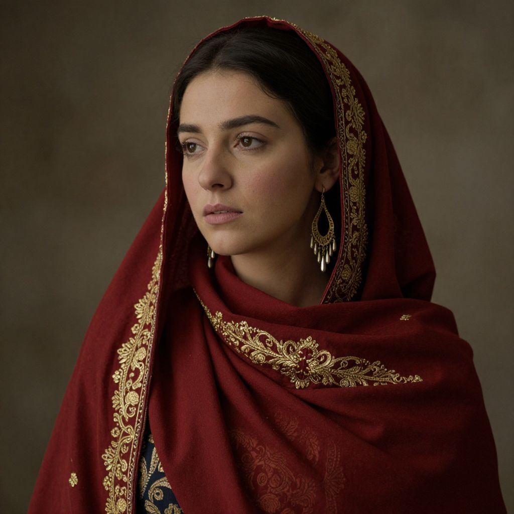 Contemplative woman wearing a richly detailed red headscarf adorned with gold embroidery and dangling earrings, her gaze directed thoughtfully to the side, set against a muted, textured background that accentuates her serene expression and historical attire.