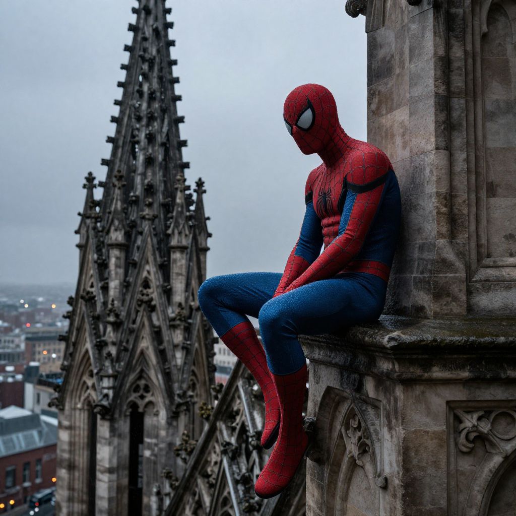 Photograph of Spider-Man in a purple suit, crouching on a gothic cathedral's stone pinnacle, moonlit sky, and colorful stained glass