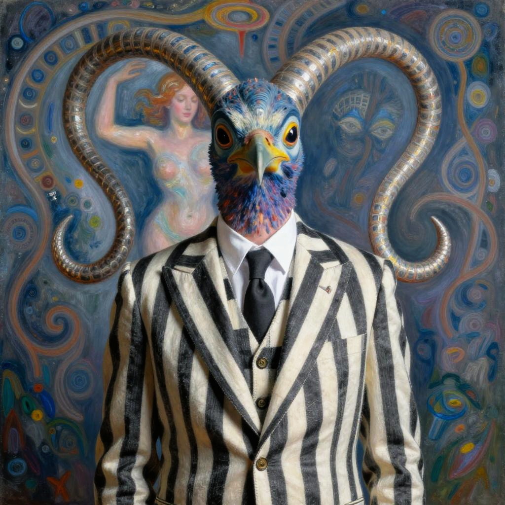 Digital painting of a humanoid bird with blue feathers, yellow beak, and large silver horns, wearing a black-and-white striped suit, against a swirling
