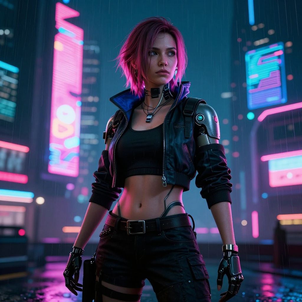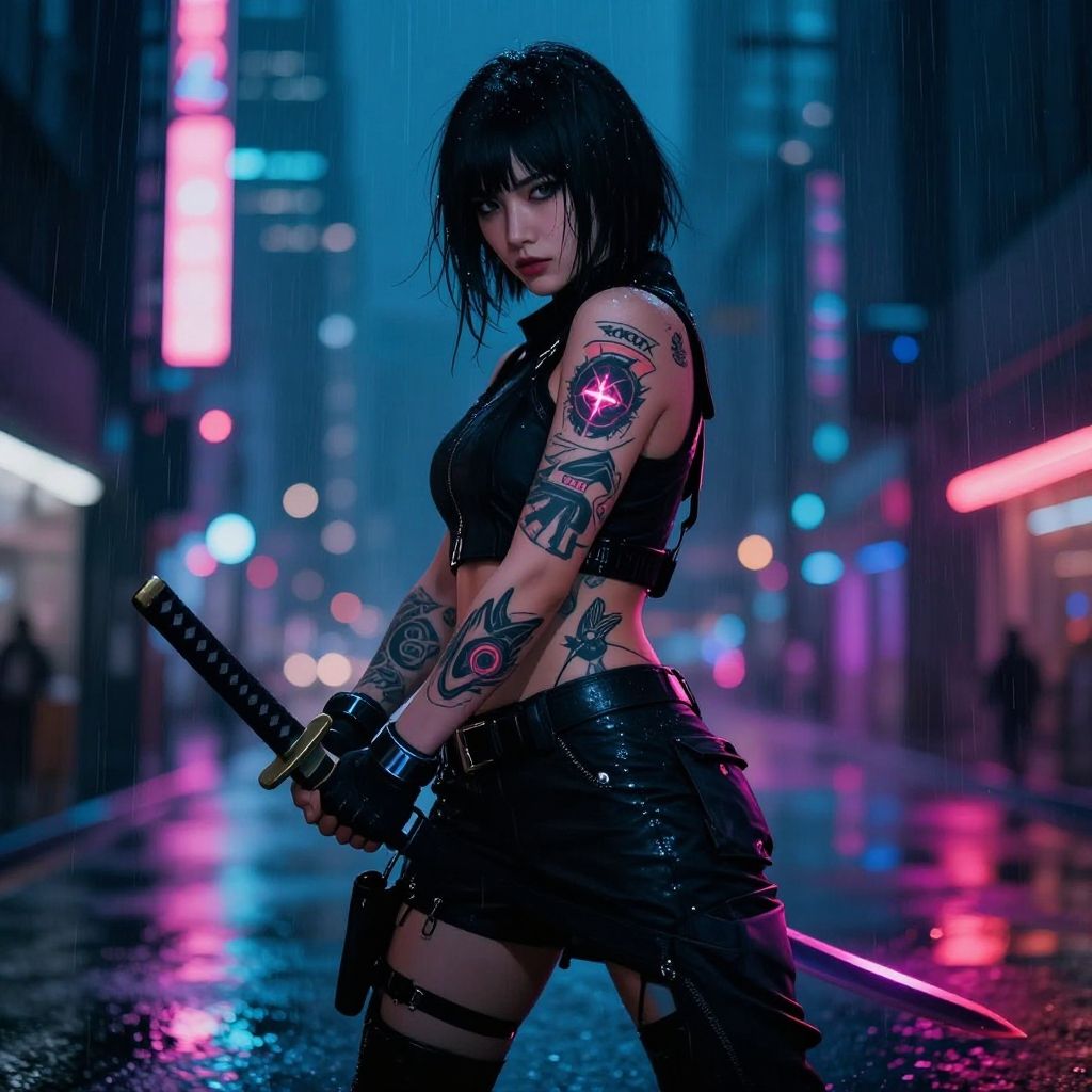 Female fighter art, cyberpunk assassin with glowing tattoos and katana, urban night scene, rain reflections, vibrant neon hues, sleek design, moody atmosphere, highly detailed illustration