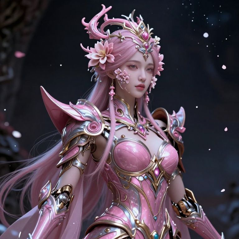The image depicts a highly detailed and intricate depiction of a mythical, cosmic figure, likely a goddess or immortal princess. The figure is adorned with elaborate, hyper-realistic armor and headgear, featuring intricate designs and textures that suggest a blend of organic and mechanical elements. The armor is predominantly pink, with shades of silver and gold, creating a striking contrast against the dark, shadowy background. The figure's face is adorned with delicate, flower-like decorations, adding to the ethereal and otherworldly atmosphere. The background is dark and shadowy, with subtle glimmers of stardust-like particles that add a sense of depth and dimension to the scene. The overall composition is balanced, with the figure centrally positioned and surrounded by floating petals and particles, enhancing the surreal and mythological theme. The image is a stunning example of digital manipulation, combining elements of fantasy, mythology, and cosmic themes to create a visually captivating and immersive experience.