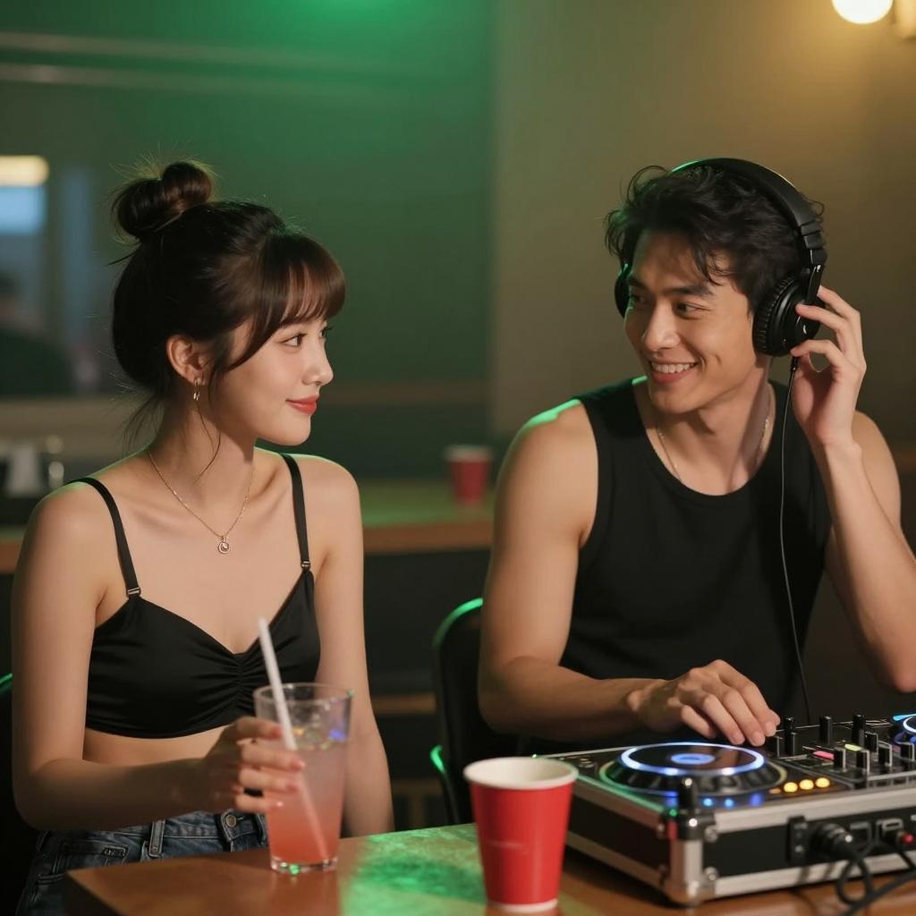 Two people in a dimly lit room. Female on left with dark hair in high bun, black bra, holding pink drink. Male on right with headphones, black tank top, DJ equipment. Red cup on table. Green and yellow blurred background. Male smiling, female smiling slightly. Both seated. Male adjusting headphones.