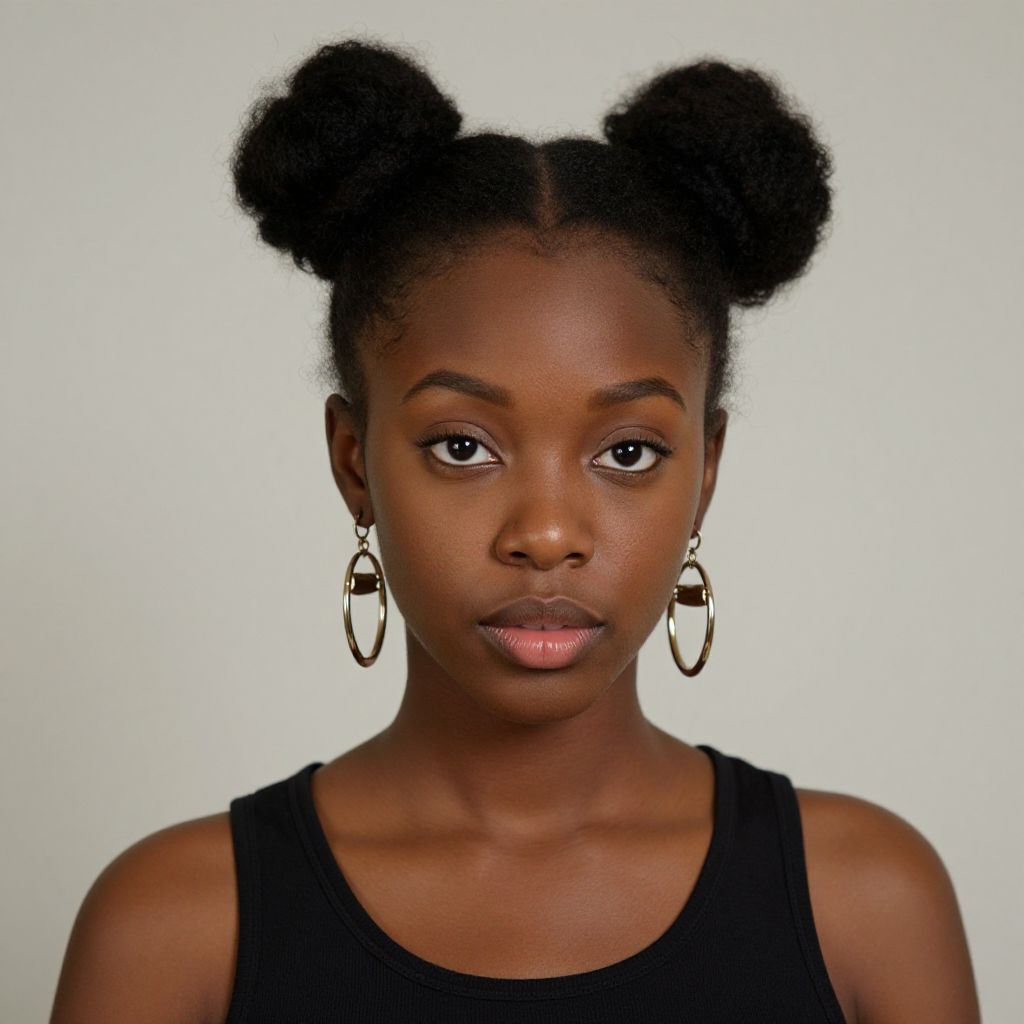 Photograph of a young Black woman with dark brown skin and a smooth complexion, facing the camera. She has two high, fluffy, natural Afropuff hair buns. Her almond-shaped eyes are slightly downcast, and she has full, pink lips. She wears a black sleeveless top and large, silver, teardrop-shaped earrings. The background is plain white, highlighting her features. The image has a clean, minimalist style, focusing on her face and upper torso. The lighting is even, eliminating shadows and emphasizing her natural beauty.