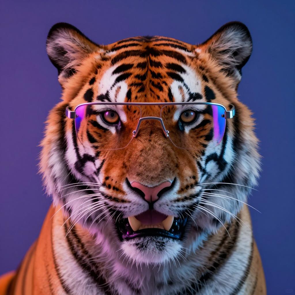 Close-up portrait of a photorealistic tiger wearing large futuristic glasses against a solid purple background. The image features vibrant neon lighting with ultra-high detail, sharp focus, and smooth texture, rendered in a 3D style with advanced rendering techniques.
