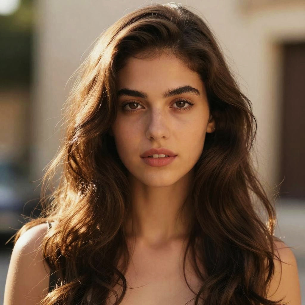 Portrait of a person with medium brown wavy hair softly tousled, intricate waves and natural shine, warm afternoon lighting, realistic skin texture, soft background, ultra-detailed hair strands and highlights